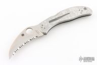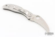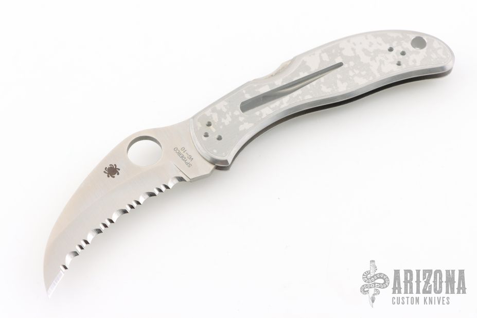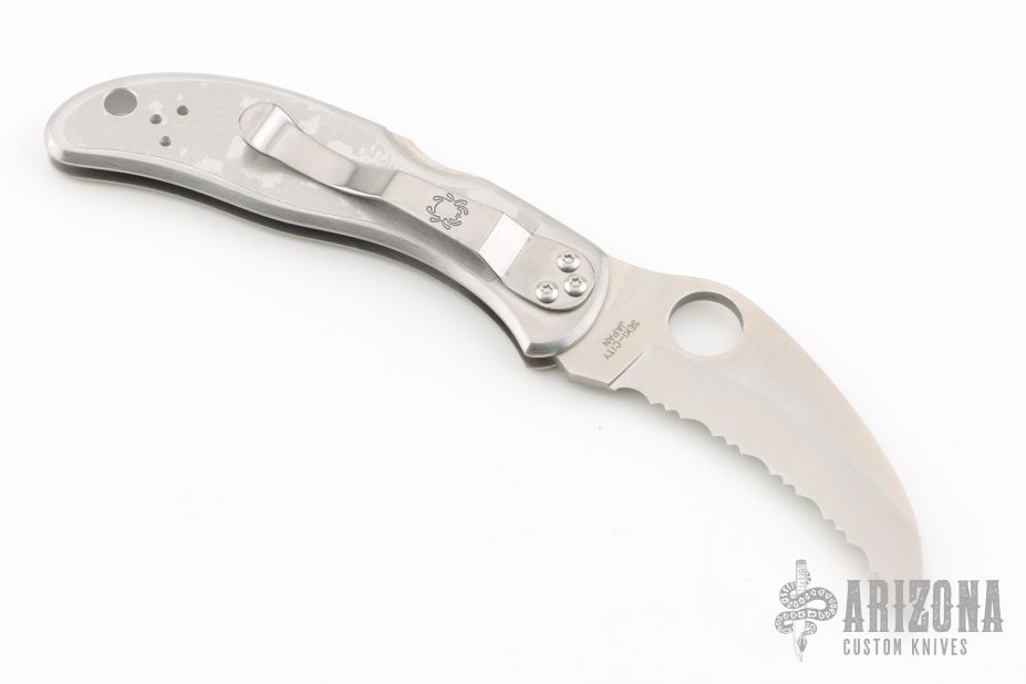This Harpy by Spyderco features a hawkbill fully serrated blade with thumbhole. The handle has a stainless steel frame with a stainless clip. Lanyard hole. New condition. Comes with original box. Still has plastic covers on the scales