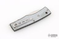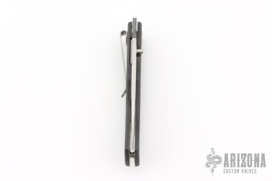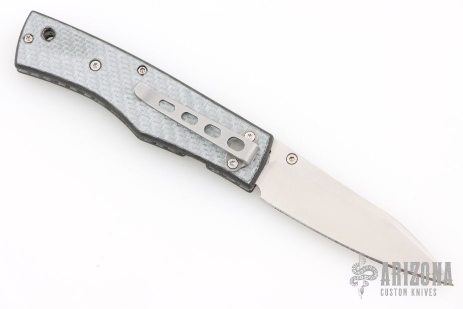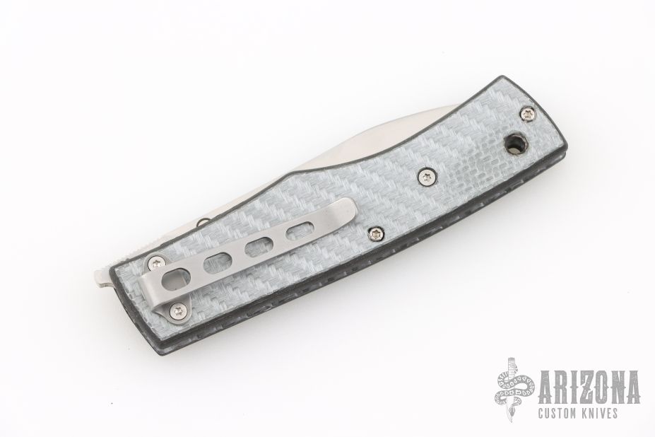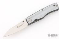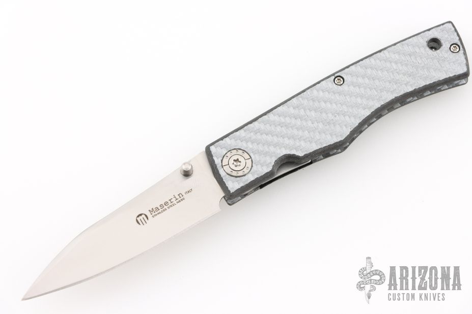 The 392 Carbon Line Folder by Maserin is a mid-size linerlock folder with 3" blade and silver carbon fiber handles. At only 1.7 oz, you'll barley notice it in your pocket. Although the 392 does not include thumb studs or thumb hole, with a little bit of practice, it can still easily be opened using one hand with the help of the jimping on the spine of the blade. Very smooth opening action and a tip-down pocket clip. Just overall an excellent choice for anyone looking for a solid, modern EDC knife.