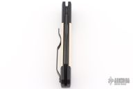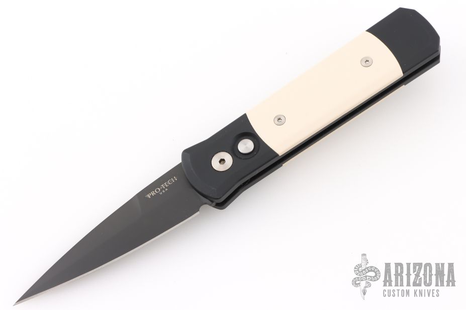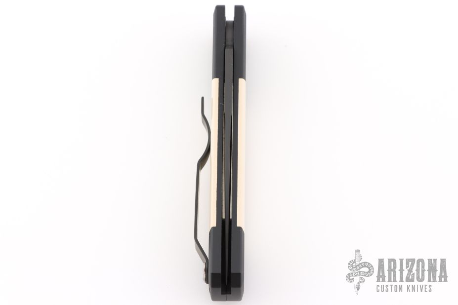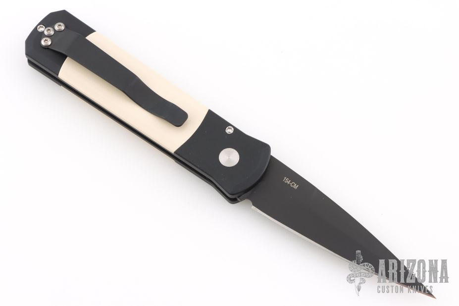 This side opening auto features a black spear point blade with a false top edge. The handle has a black aluminum frame with ivory micarta scales and a black stainless steel clip, tip up carry. Comes with original box and papers. Excellent condition.
