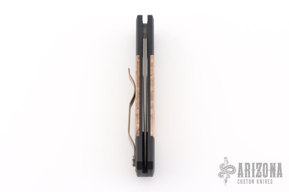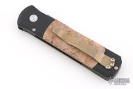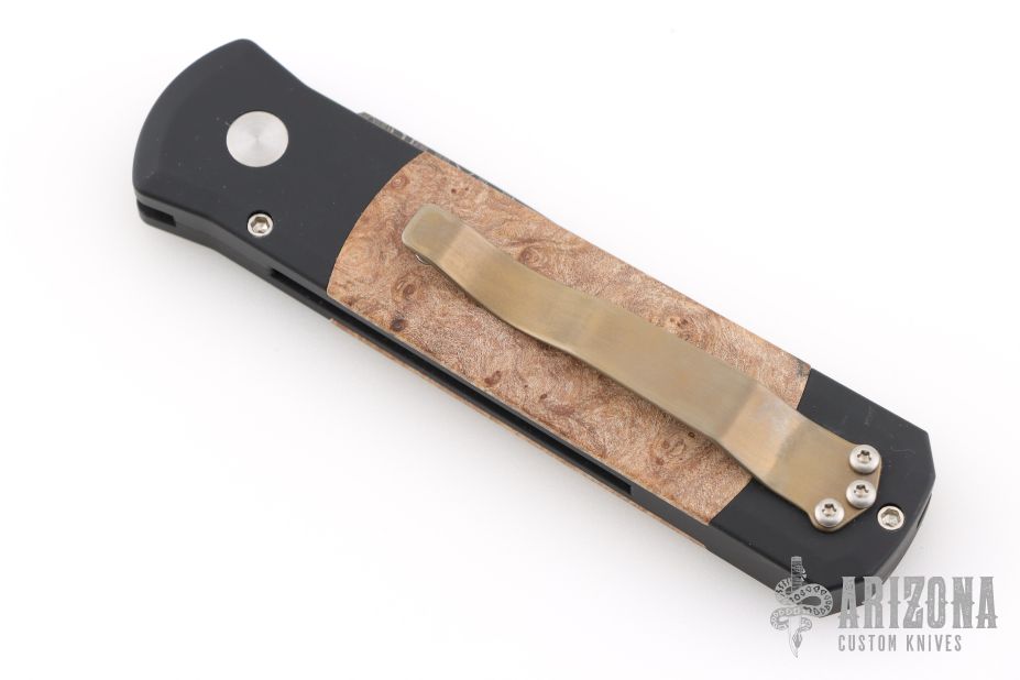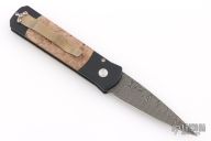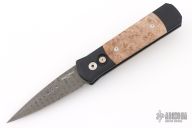 "Like Father, Like Son. This is the highly anticipated 3.25" blade version of our popular Godfather automatic knife. Italian Inspiration and American Innovation have created another superior coil spring action auto knife." This Godson side opening coil-spring automatic features a Nichols Damascus blade and anodized black frame with maple burl inlays. Satin anodized titanium clip. Comes with original box pouch and papers. Excellent condition.
