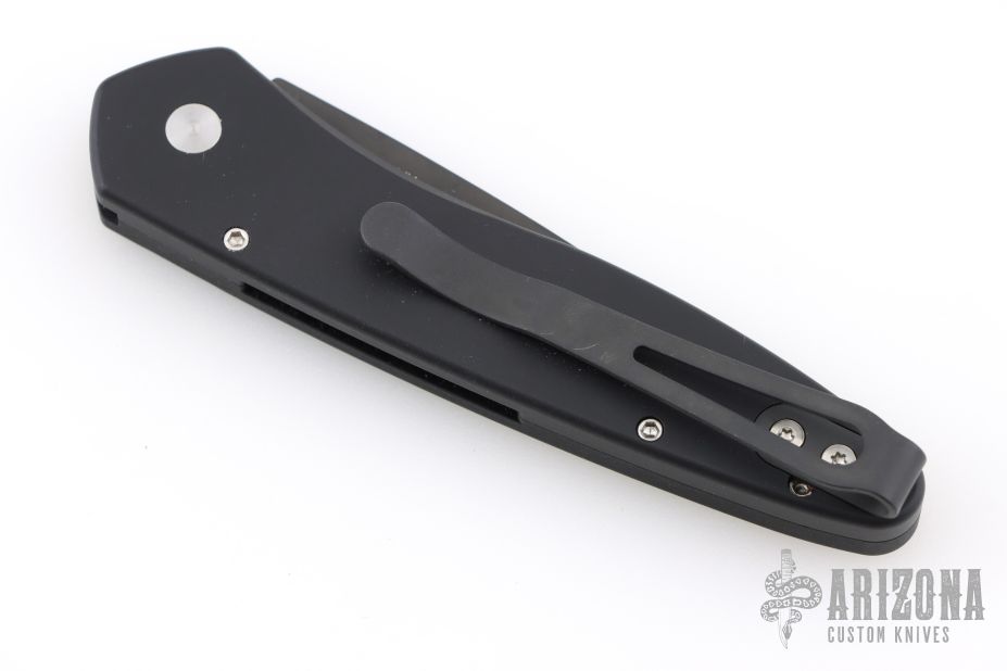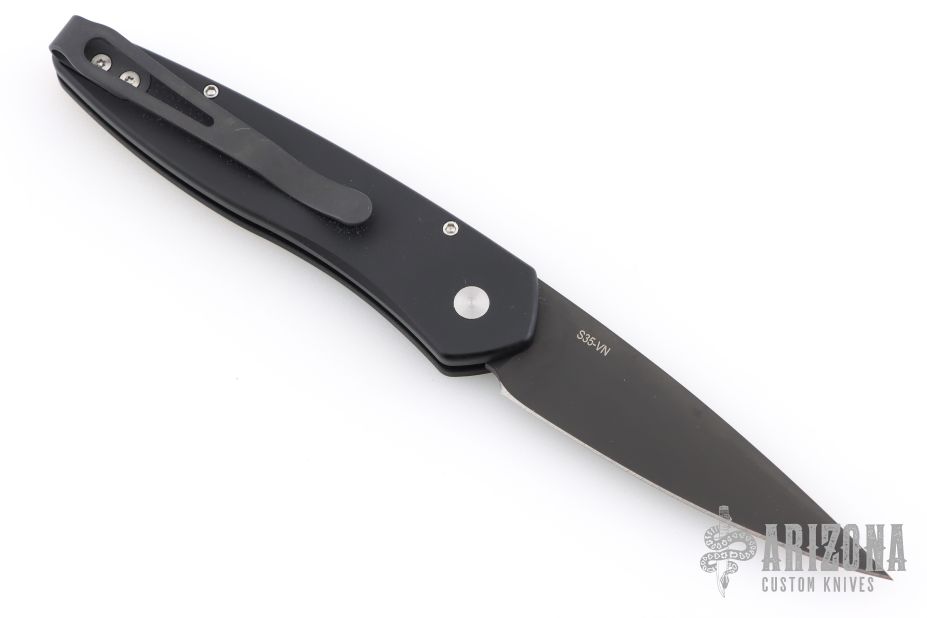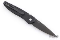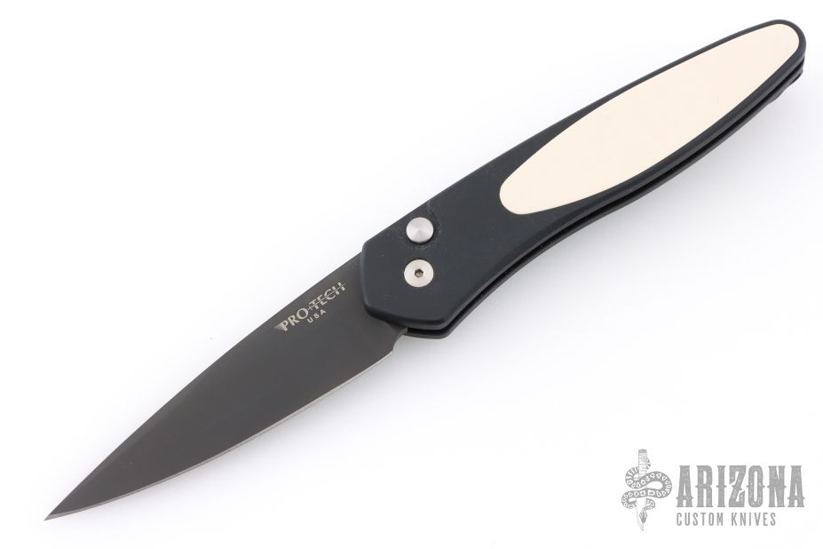 This Newport by Protech Knives features a black spearpoint blade and black aluminum handle with ivory paper micarta inlay, tip up stainless steel clip. Comes with original black clamshell style box with outer paper sleeve. Excellent condition.