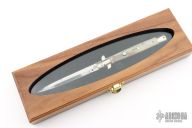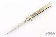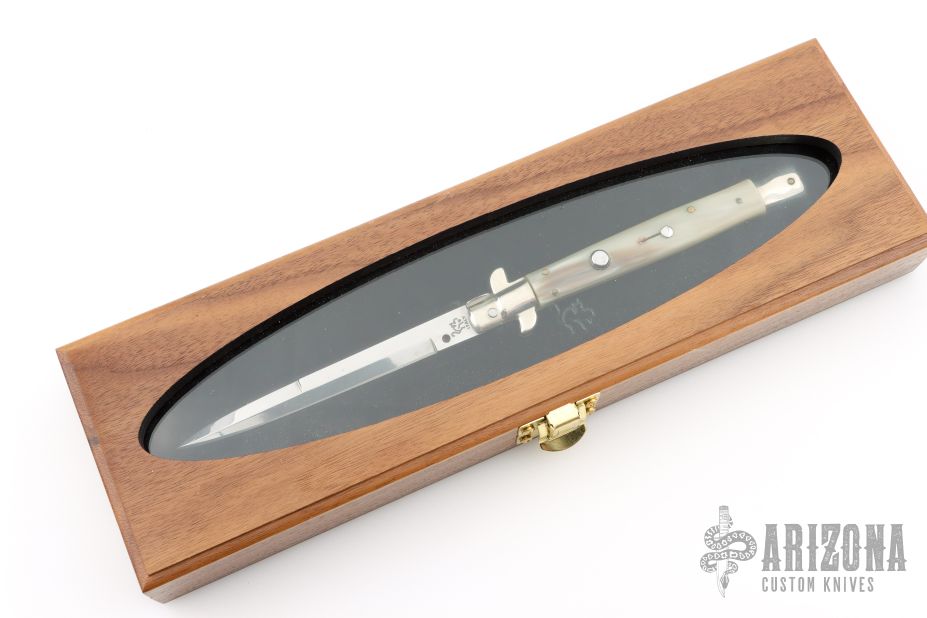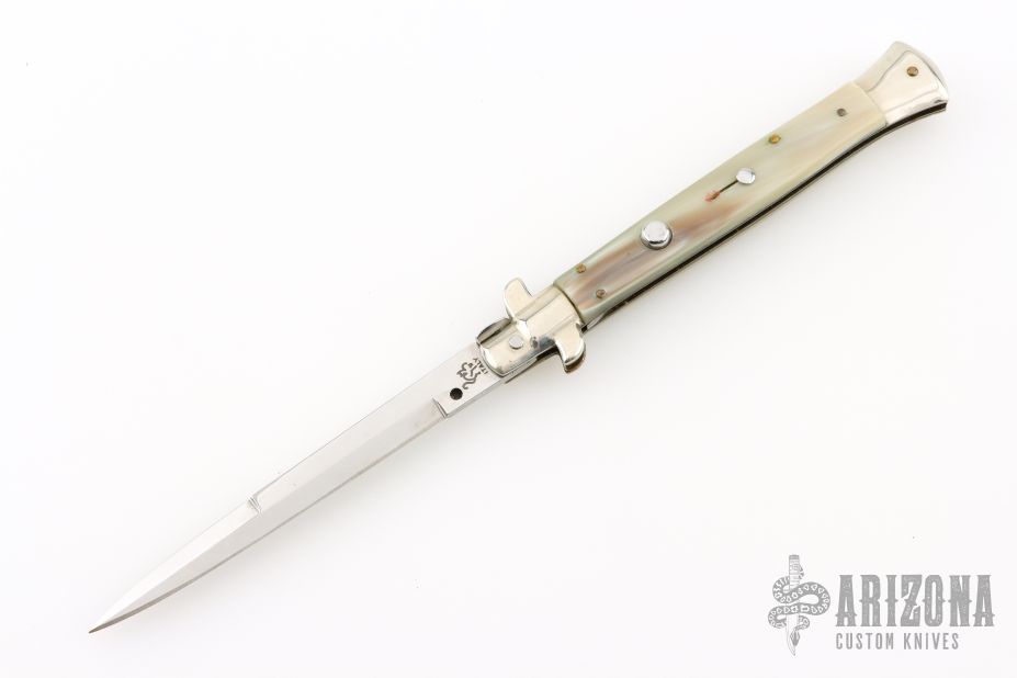 This 11" Picklock by Walts Italy features a polished bayonet ground blade with false top edge. The handle has nickel silver bolsters, front and rear, honey horn scales, brass liners, flat button, stainless spring. Has some light scratches, otherwise excellent condition. Comes with a wooden presentation box.
