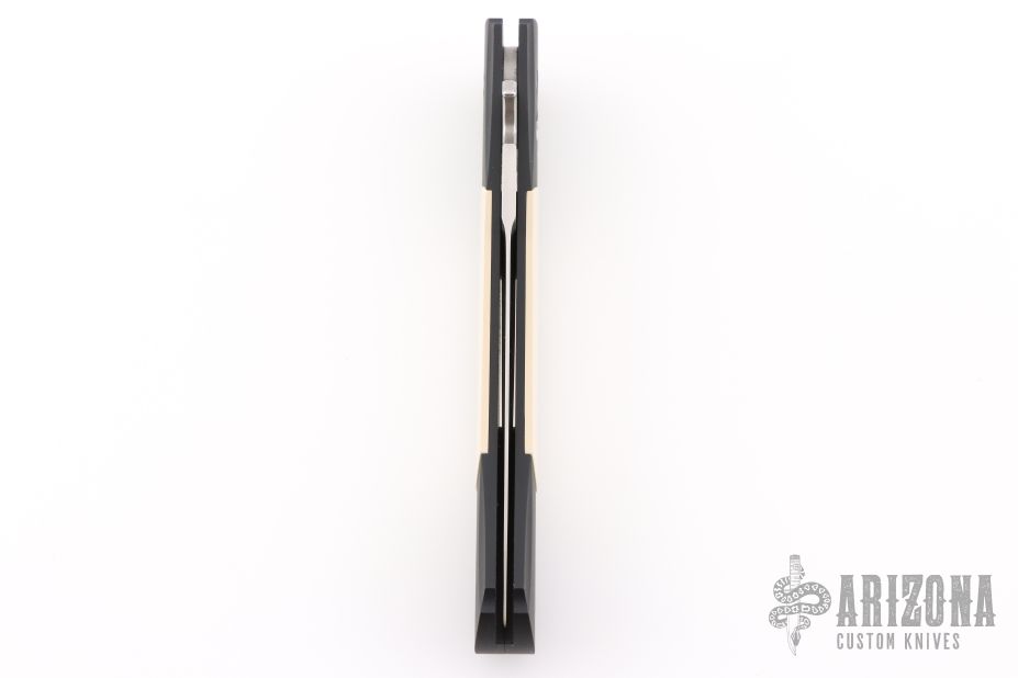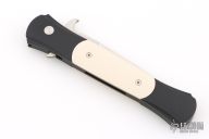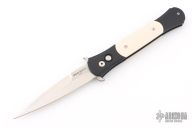 "Classic styling, modern 3D CNC Machining, and unequaled craftsmanship have all come together perfectly for our newest auto knife ? THE DON. The frames and inlays for each DON are completely 3D machined, curved and fluted for a completely custom feel. Super smooth coil spring action! Because of the complex machining and amount of detailed hand work involved with the DON, their production will be very limited each year." This large Don features a satin finish blade and anodized aluminum frame with ivory micarta inlays. Comes with original clamshell style box. PR5 s/n 474. Excellent condition.