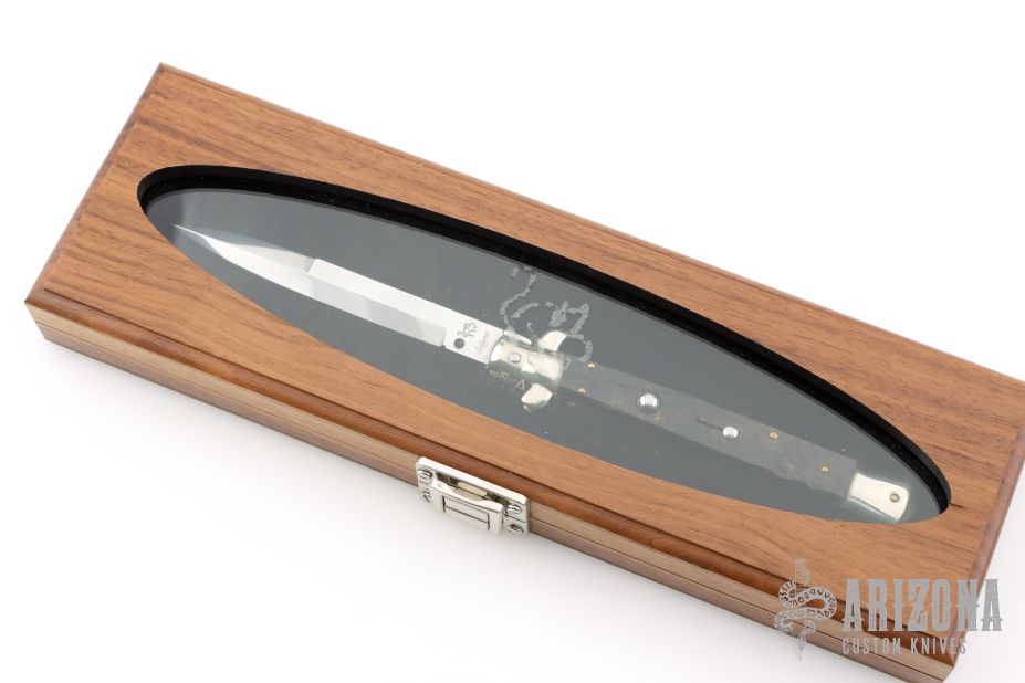 This Swivel Bolster Auto by Latama features a 5mm bayonet ground blade with a false top edge. Nickel silver guard and rear bolster and buffalo horn scales, brass liners and stainless steel backspacer. Nice function, strong firing and lock up. Has a couple light scratches, otherwise excellent condition. Comes with a wooden display box.