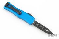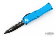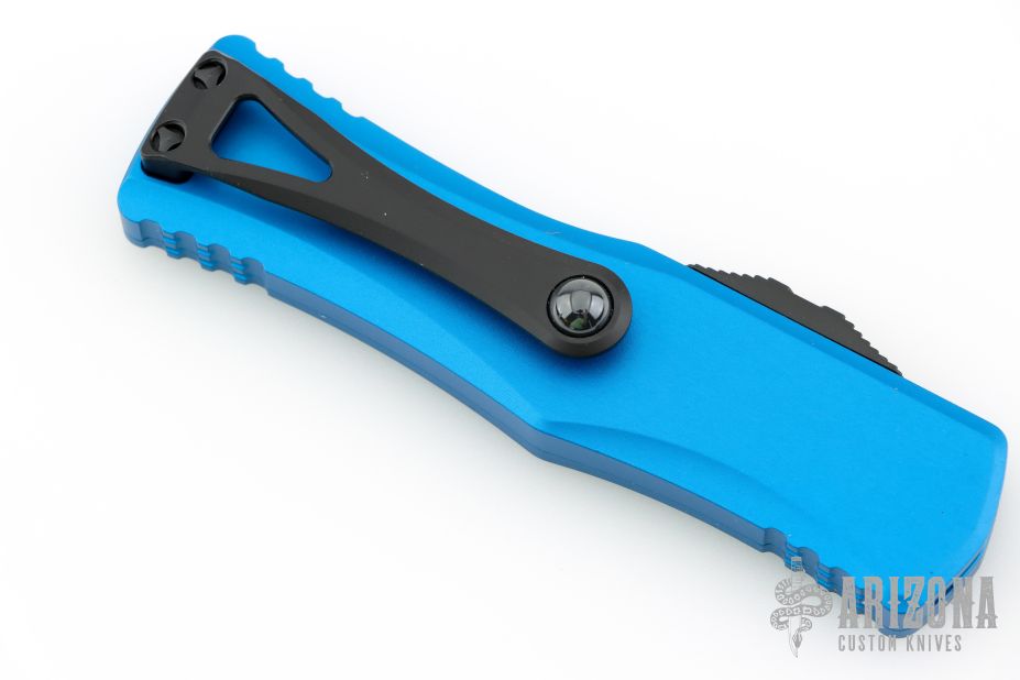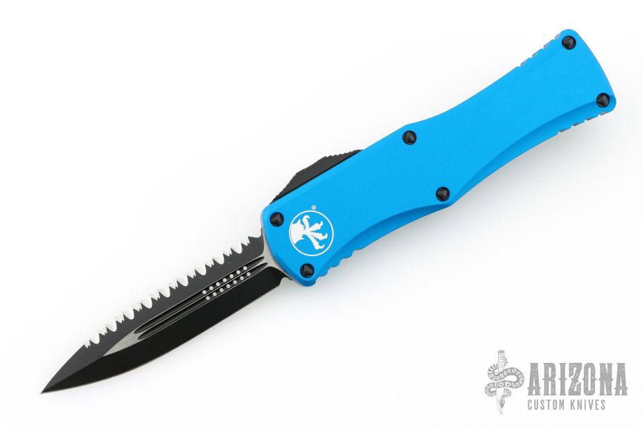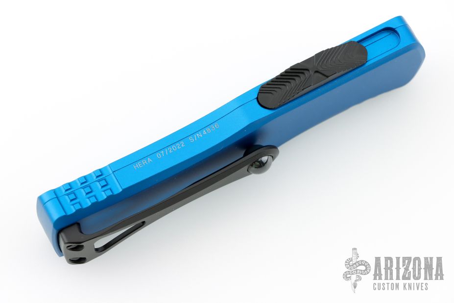 This Hera by Microtech Knives features a stonewashed blade with full serrations.  The handle has a blue aluminum frame with a tip down titanium clip with ceramic ball inset. Dated 07/2022 #4836. Comes with original box and papers. Excellent condition.
