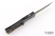 This Hera by Microtech Knives features a single-edged blade with fullers. The handle has a black aluminum frame with "Source" artwork, a tip down titanium clip with ceramic ball inset. Dated 06/2022 and s/n 478. Comes with original box, papers, and metal COA. Excellent condition.