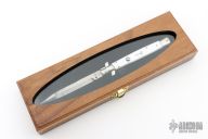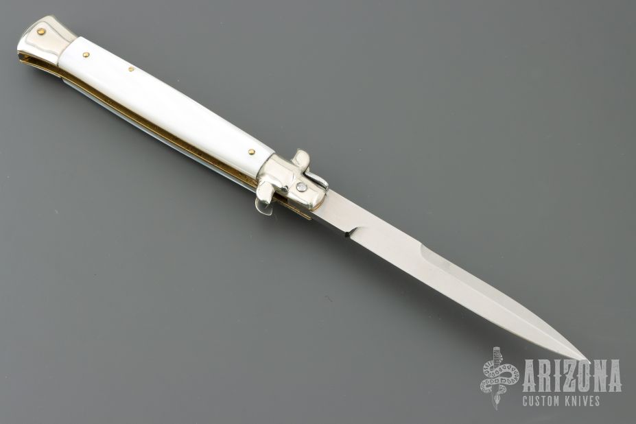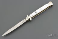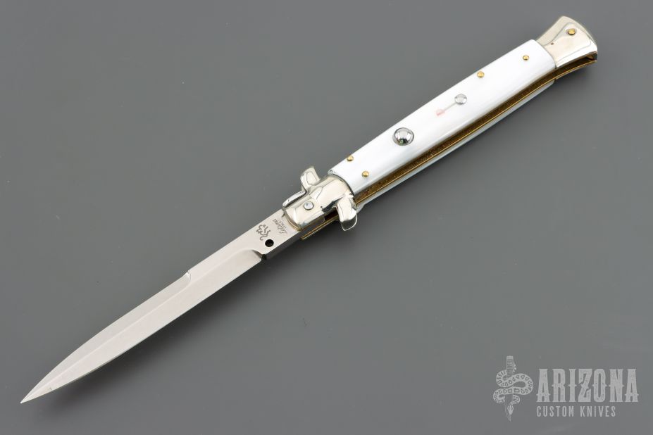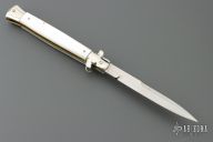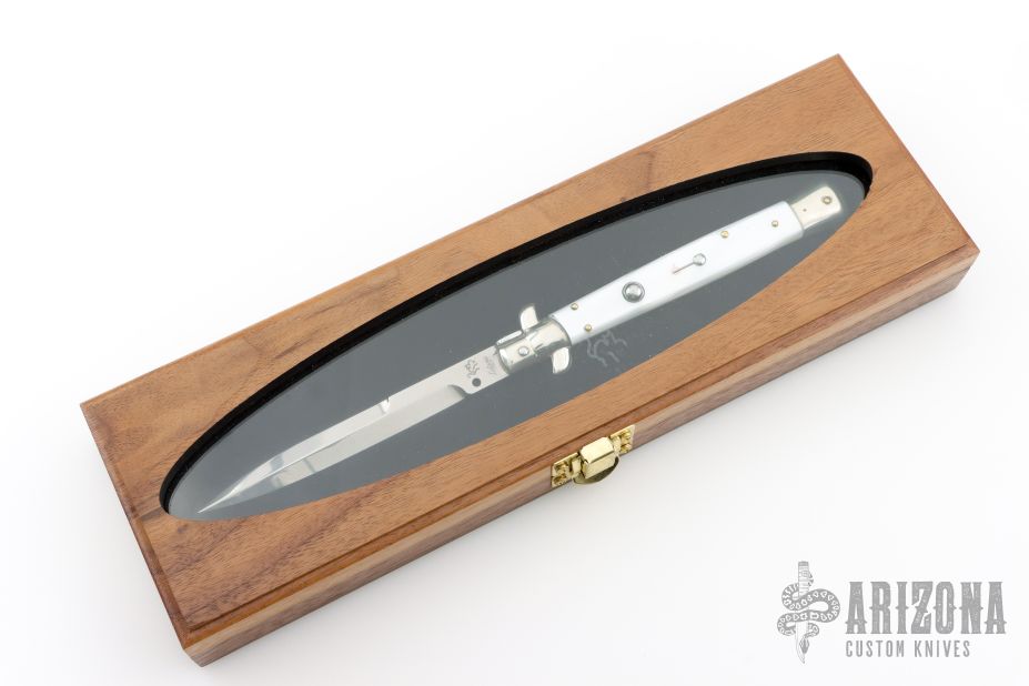 This Swivel Bolster Auto by Latama features a 5mm bayonet ground blade with a false edges. Nickel silver guard and rear bolster, pearlex scales, brass liners and stainless steel backspacer. Nice function, strong firing and lock up. Has a couple light scratches, otherwise excellent condition. Comes with a wooden display box.