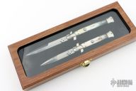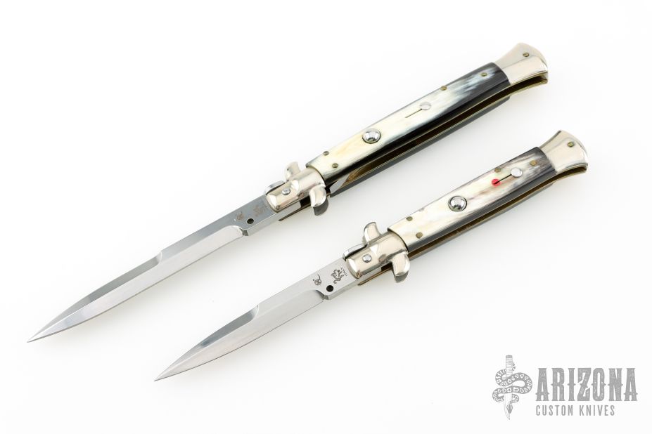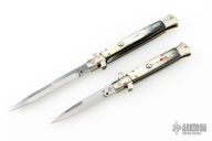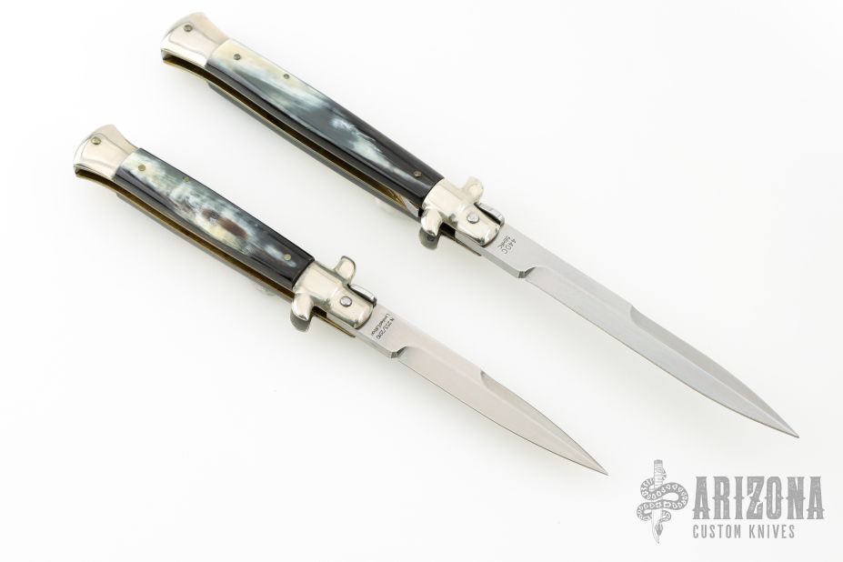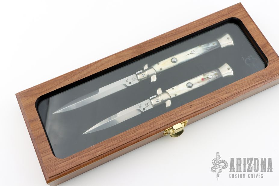 These 11" and 9" Swivel Bolster Autos by Latama features a 5mm bayonet ground blades with a false top edge. Nickel silver guard and rear bolster and buffalo horn scales, brass liners and stainless steel backspacer. Nice function, strong firing and lock up. Excellent condition. Comes with a wooden display box.