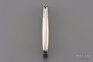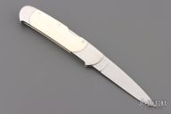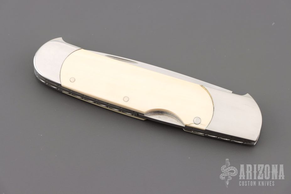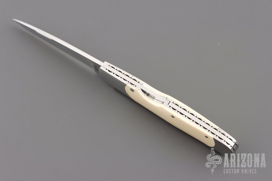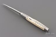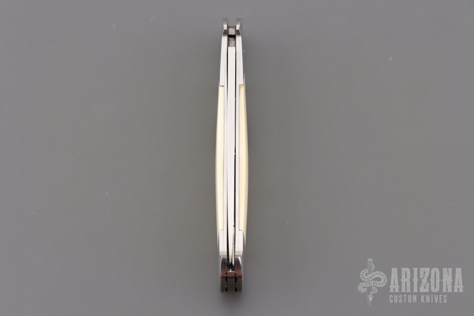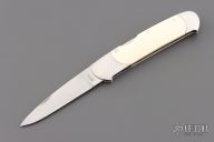 This Mid-Lock by Robert Merz features a hand rub satin finished blade with nail nick. The handle has stainless steel bolsters, mammoth ivory scales, fileworked stainless steel liners and backspacer. Nice lockup and blade seating. Has a few light scratches, and a crack in both of the two scales at the same pin, otherwise good condition.