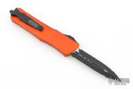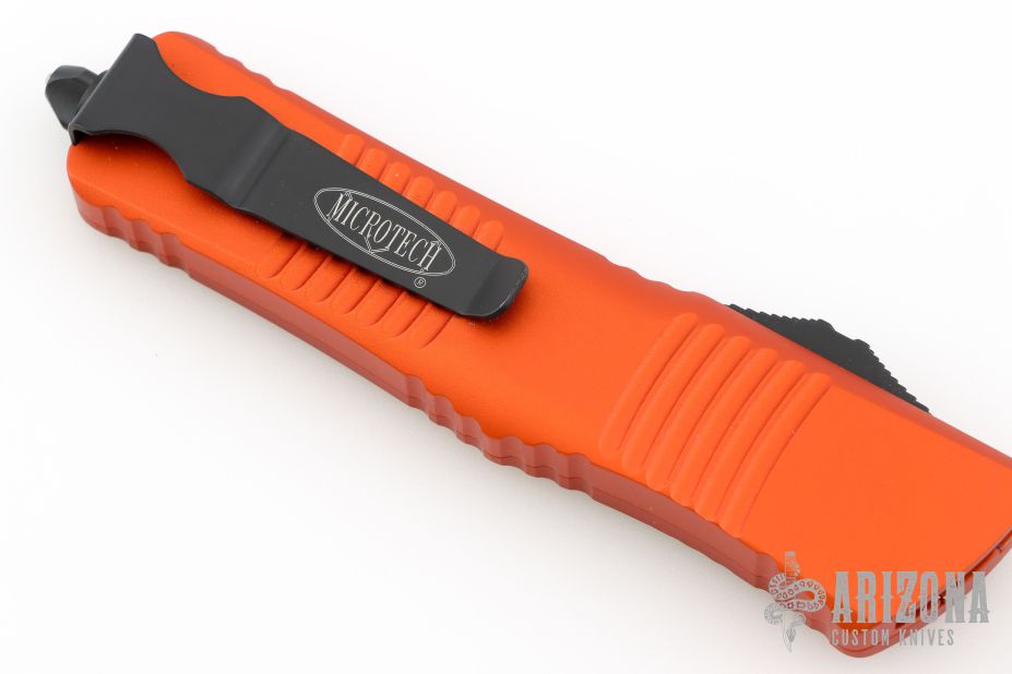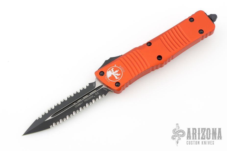 This Combat Troodon OTF automatic by Microtech knives features a black double edged double full serrated blade, and an orange aluminum handle with black hardware, tip down carry. Glass breaker. S/N 25743. Dated 11/2019. Comes with original box. Excellent condition.