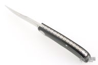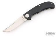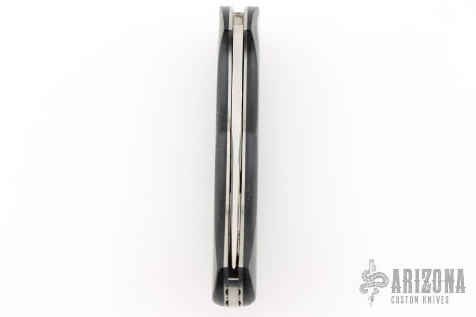 This Slipjoint by Robert Merz features a hand rub satin finished blade with nail nick. The handle has black G-10 covers, fileworked stainless steel liners and spring. Has half-stop, flush in all positions. Nice action and blade seating. Excellent condition.