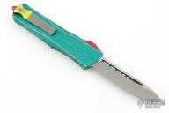 This Combat Troodon by Microtech features an Apocalyptic finished tanto blade. The handle has a distressed green aluminum frame with red hardware and a tip down stainless steel clip. Comes with original box and papers. Dated 05/2020=2 and s/n 1955. Excellent condition.