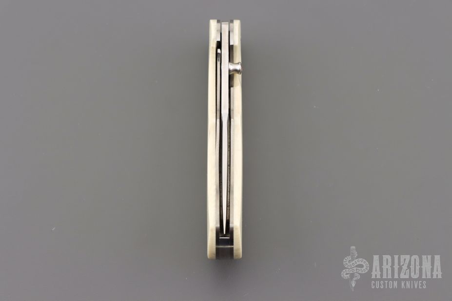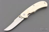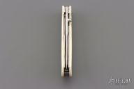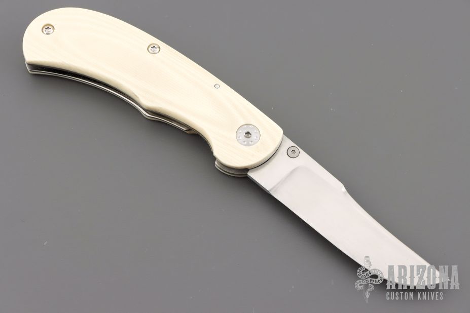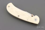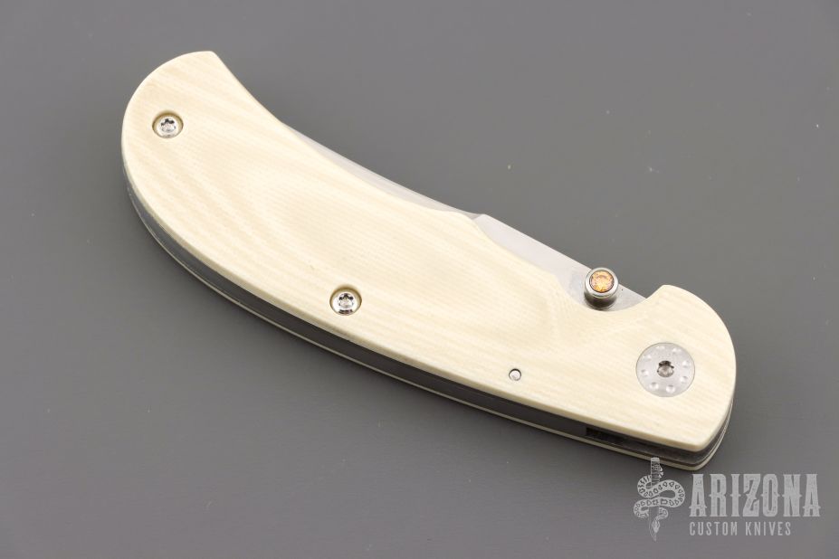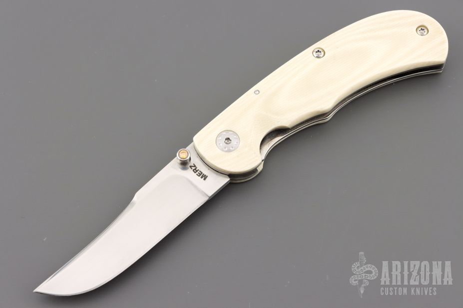 This Linerlock by Robert Merz features a hand rub satin finished blade with single thumbstud with citrine inset. The handle has white G-10 covers, titanium liners and a stainless steel backspacer. Nice detent, lockup and blade seating. Has some light scratches, otherwise excellent condition.