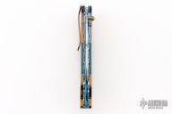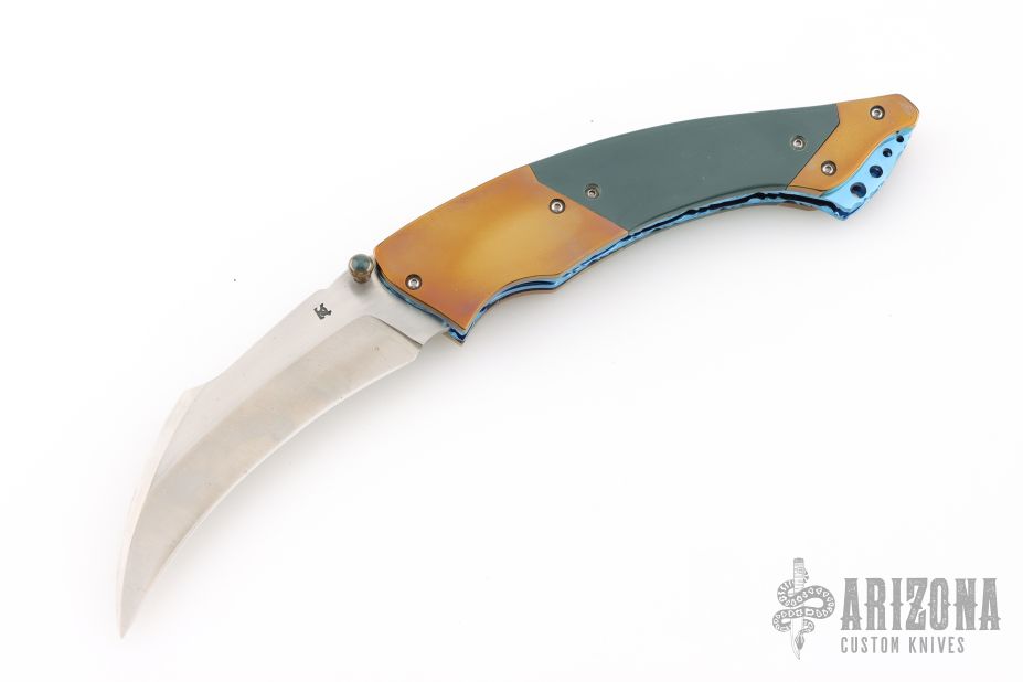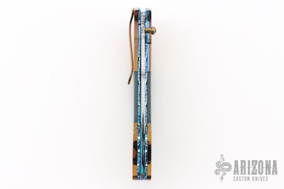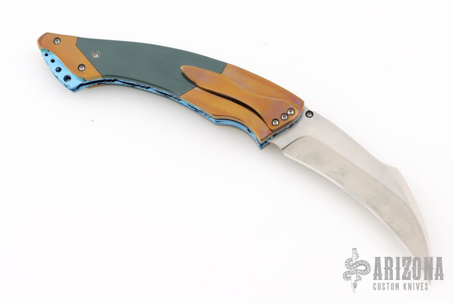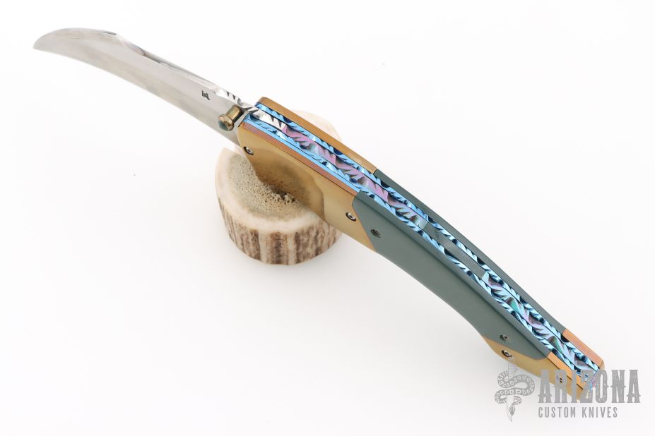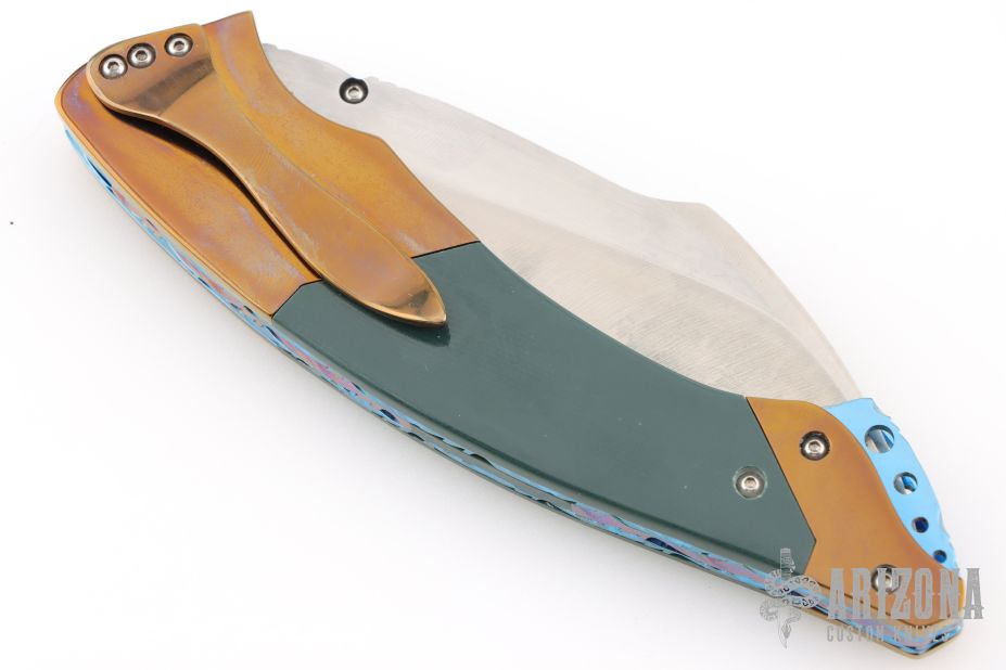 This assisted opening linerlock (please let us know if you recognize this makers mark and know who this maker is) features a satin finished blade with fileworked spine and single thumbstud with green G-10 inlay. The handle has anodized titanium bolsters, green G-10 scales, fileworked and anodized titanium liners and backspacer with green G-10 inlay, tip down anodized titanium clip. Excellent condition.