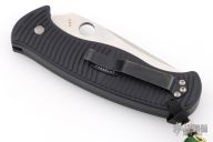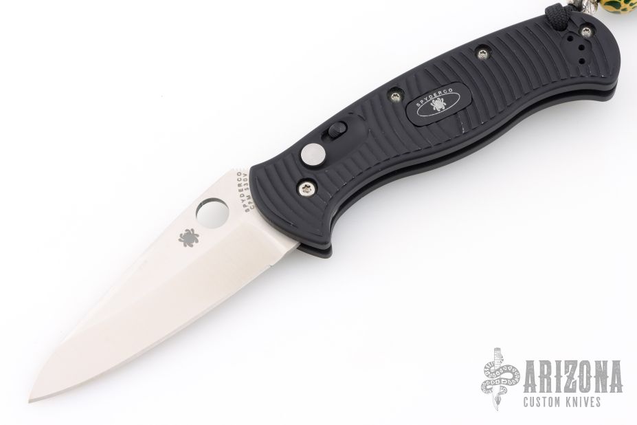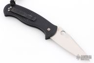 This side opening automatic features a satin finished blade with sedge, thumbhole and notched thumb ramp. Frame is milled and textured black aluminum with push button and safety. Clip is tip up carry, and reversible for right or left-handed carry. Comes with a Spyderco box. Has a couple of light scratches, excellent condition otherwise.