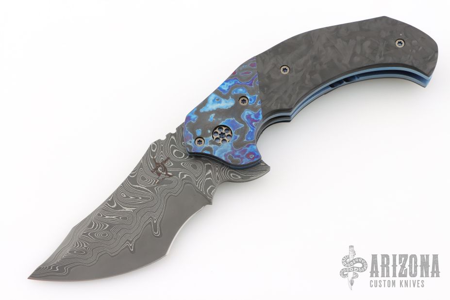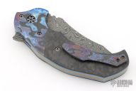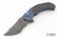 This Element Flipper by Greg Lightfoot is a JVO Design, it features a San Mai Damascus blade with notched thumbrest and a flipper. The handle has zircuti bolsters, marble carbon fiber scales, anodized titanium liners with a black stainless steel lockbar insert, anodized titanium backspacer and a zircuti tip up clip. Rides on bearings. Nice detent, lockup and blade seating. Comes with a hard case. Excellent condition.