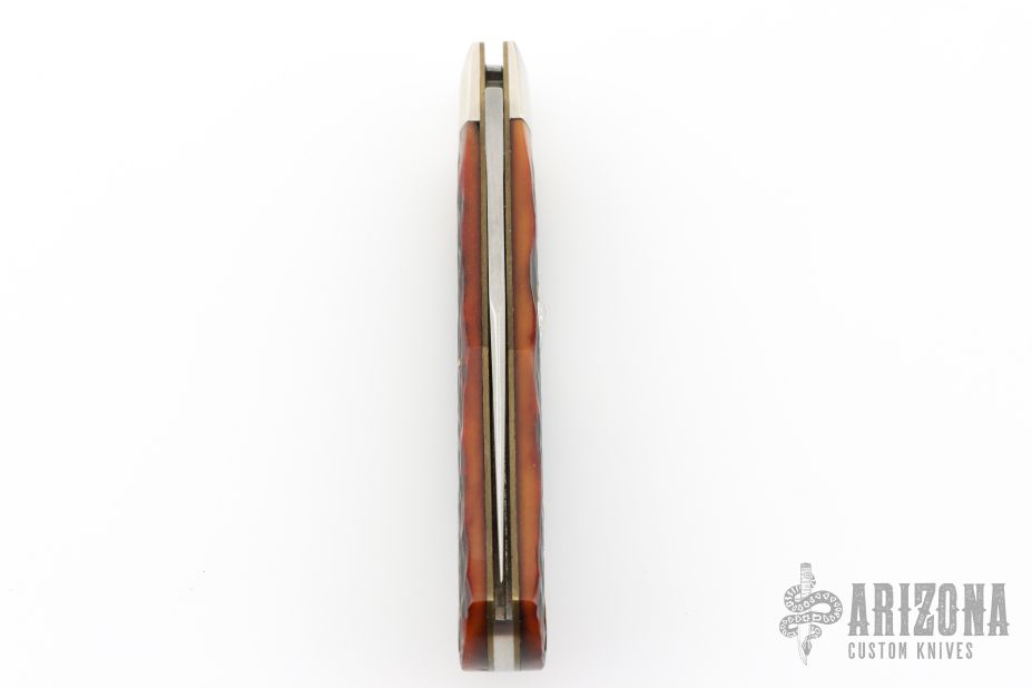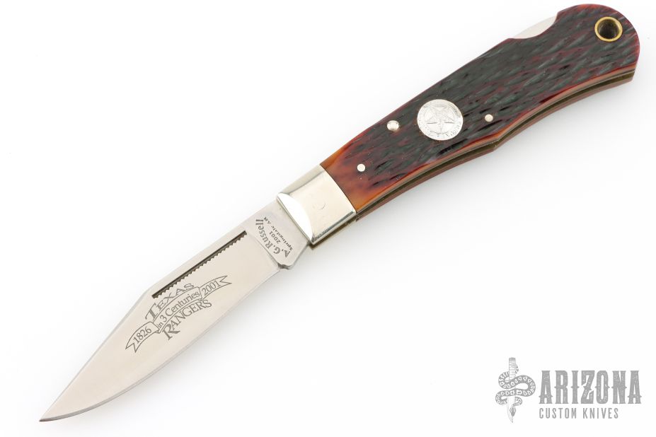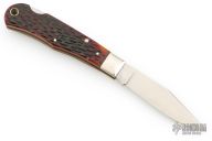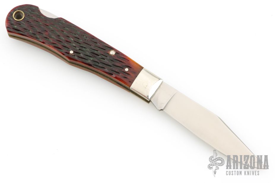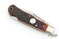 This Lockback by AG Russell features a satin finished blade with nail nick. The handle has nickel silver bolsters, jigged bone scales and brass liners. Excellent condition. Comes with original box.