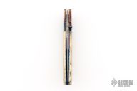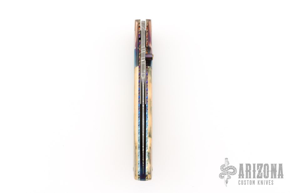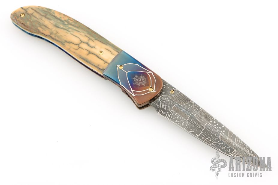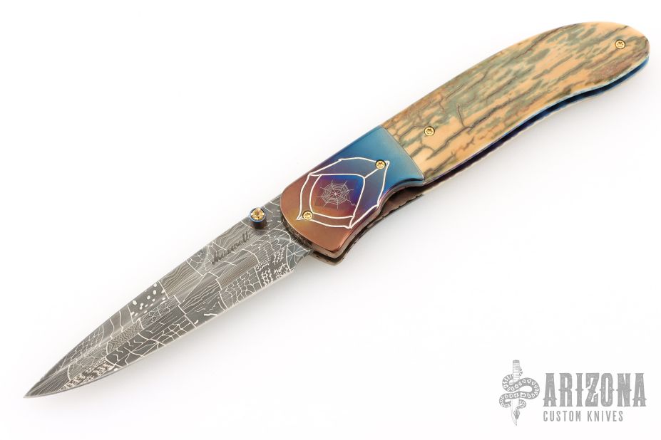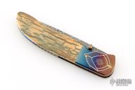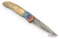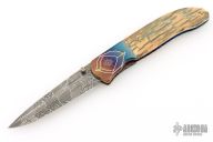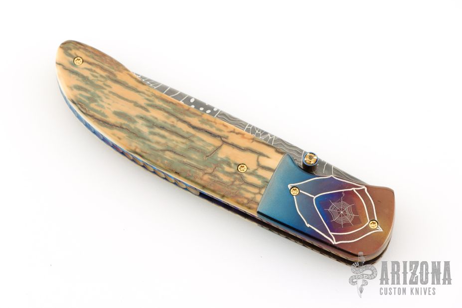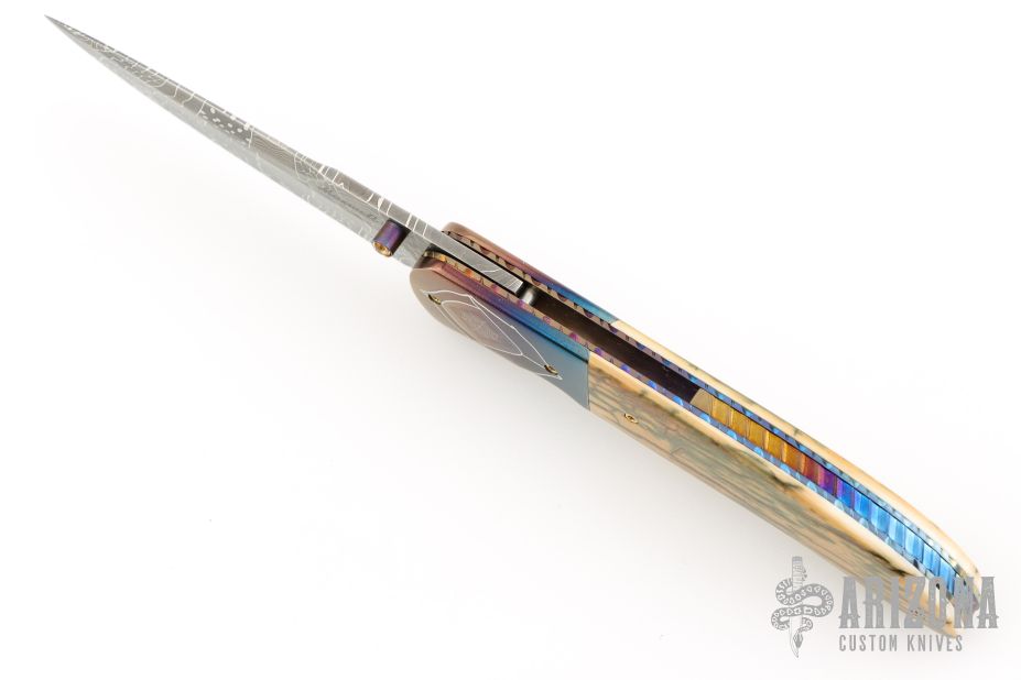 This linerlock folder by Don Maxwell features a Mosaic Damascus blade with a single thumbstud with a citrine inset. The handle has Mosaic Damascus dovetailed bolsters, mammoth ivory scales, fileworked and anodized titanium liners with jeweled interiors, fileworked and anodized titanium backspacer. Nice detent, blade seating and lockup. Comes with a zippered case. Excellent condition.