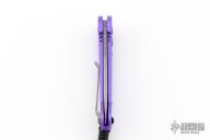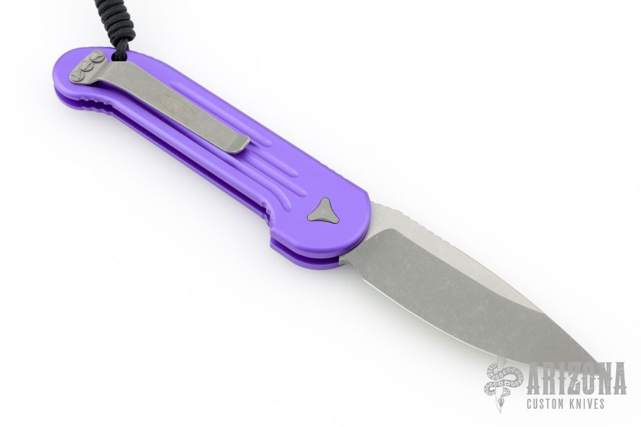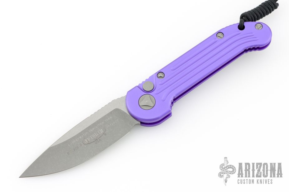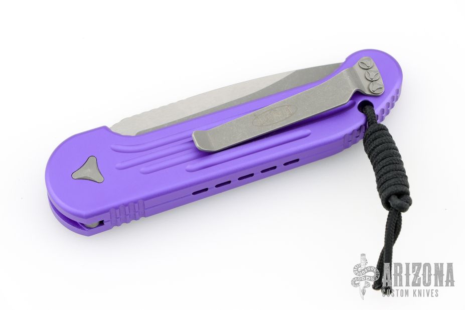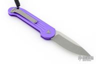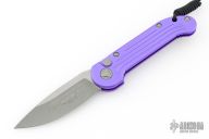 This LUDT side opening automatic by Microtech has an apocalyptic finished blade with a standard edge and a purple aluminum frame. Stainless steel clip. Dated 05/2023 and serial number 32348. Excellent condition. Comes with original box and papers.