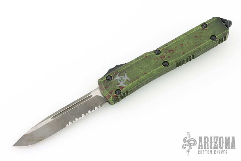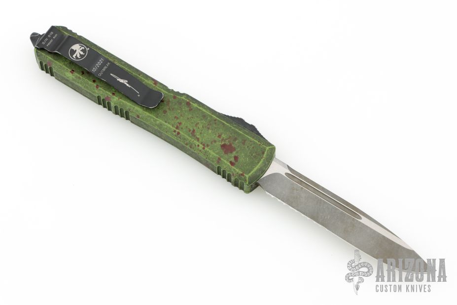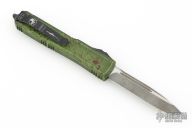 This Ultratech OTF automatic by Microtech features a S/E black blade with a partially serrated edge. Distressed green aluminum contoured frame with black hardware and tip down stainless steel clip. Dated 10/2021 and s/n 010. Includes original box and papers. Excellent condition.
