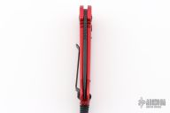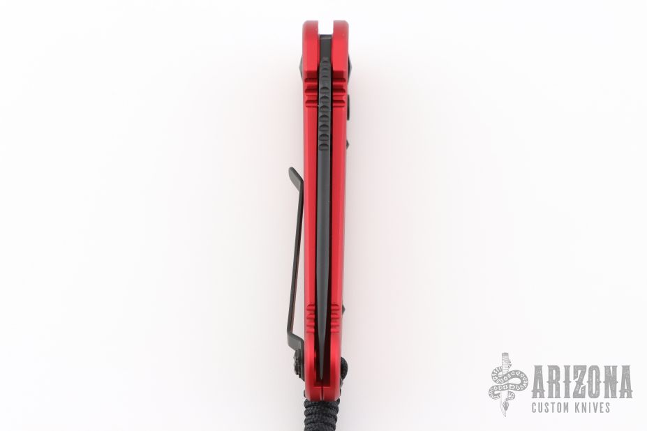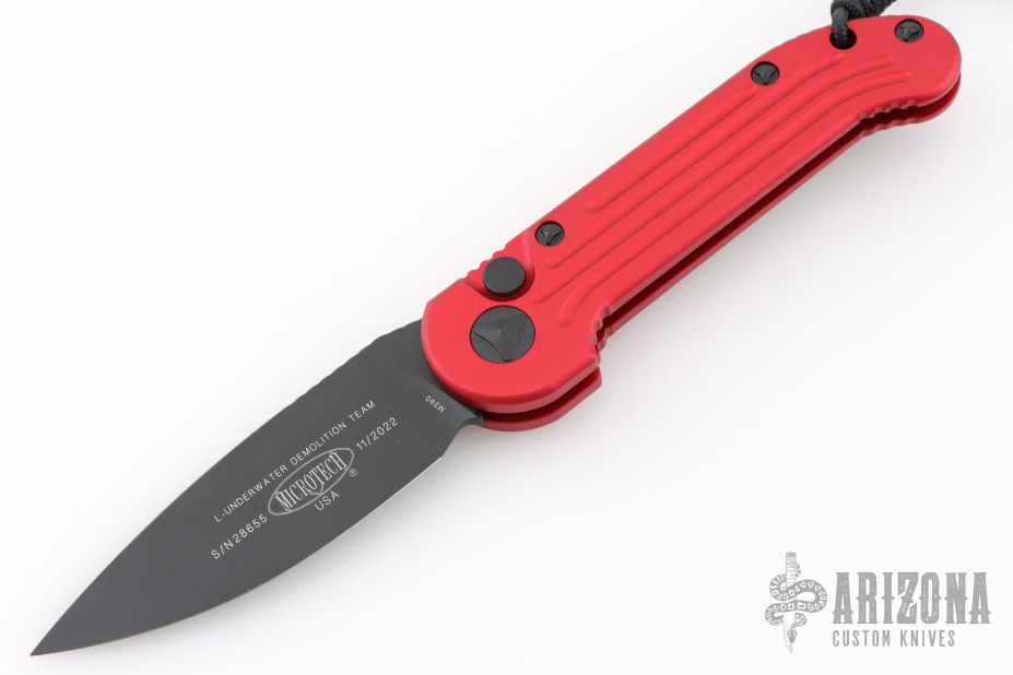 This LUDT by Microtech features a black finished blade. The handle has a red aluminum frame with black hardware and tip down clip. Comes with original box and papers. Dated 11/2022 and s/n 28655. Excellent condition.