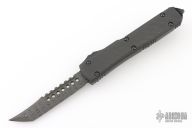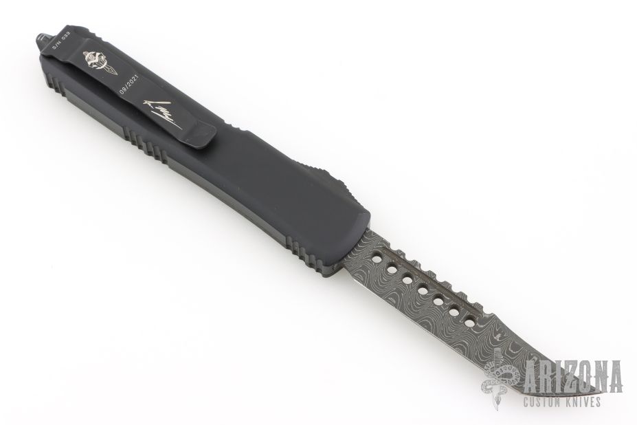 This Ultratech Hellhound Tanto by Microtech features a Damascus blade, notched thumbrest and a nearly sharpened top edge. The handle is black aluminum with ringed black hardware, black stainless steel clip, has a carbon fiber top. Comes with original box and papers. S/N 033 and dated 09/2021. Clip has the Anthony/Sean Marfione dagger logo.