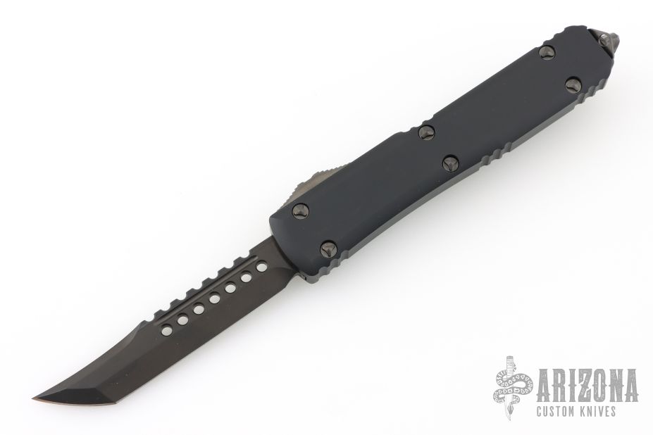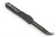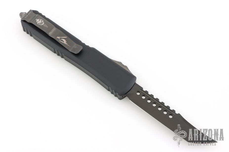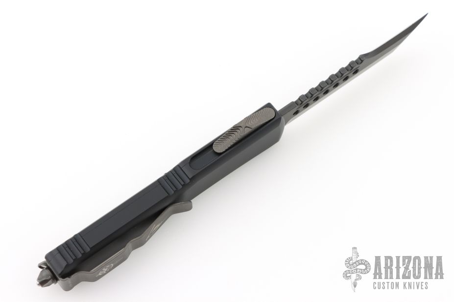 This Ultratech Hellhound by Microtech Knives features a black stonewash DLC blade with notched thumbrest and fullers, false top edge. The handle has a black aluminum frame with tip down black stainless steel clip, black DLC hardware, black titanium thumbslide. Comes with original box and papers. Excellent condition. Dated 09/2021 and s/n 408