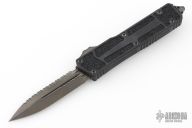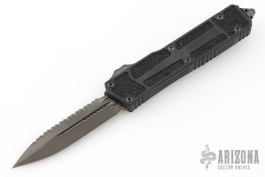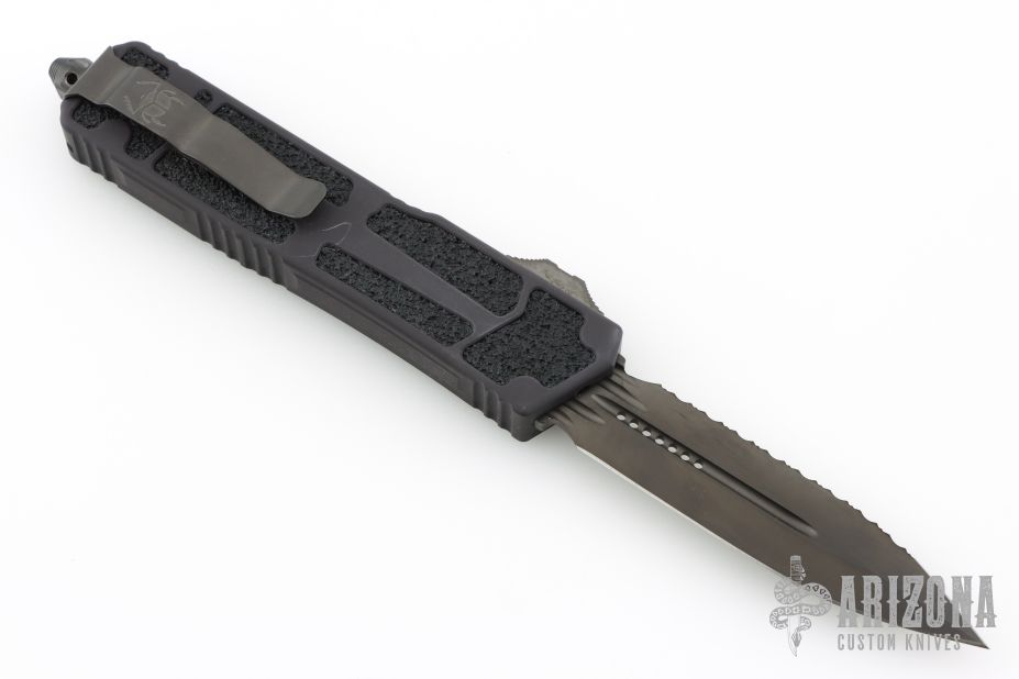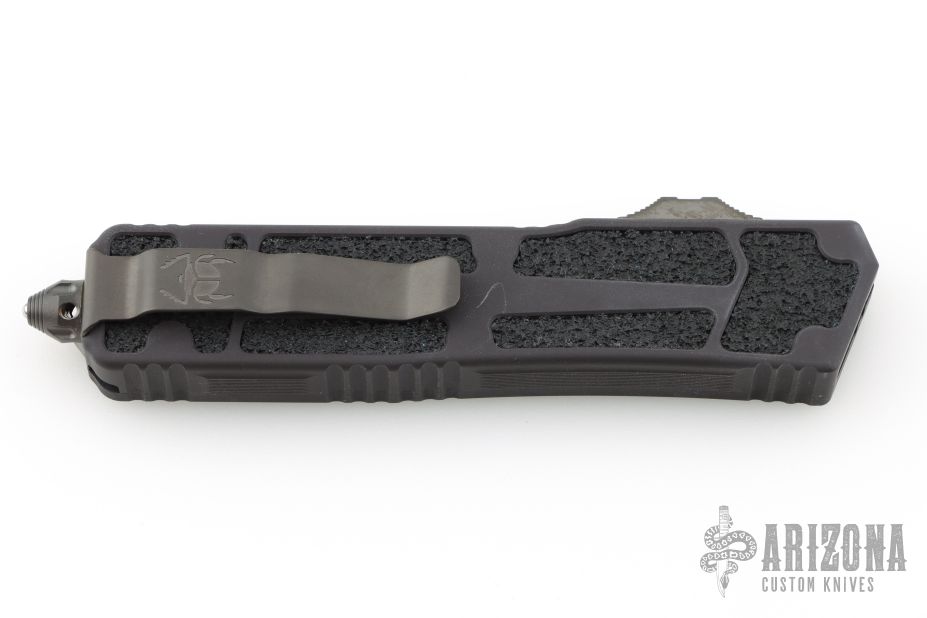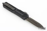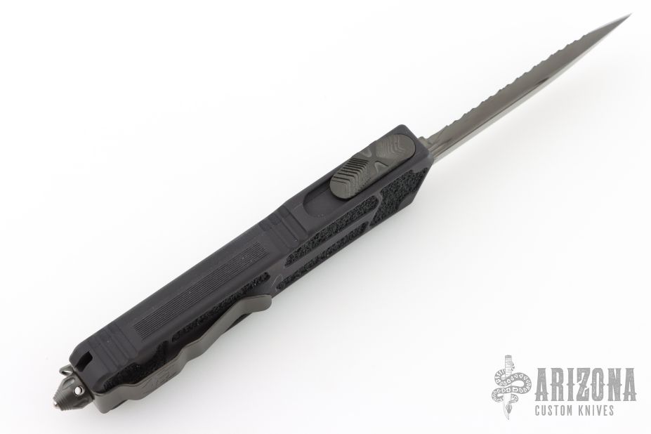 The Microtech Scarab II is a high quality tactical out-the-front knife, based on the original Microtech Ultratech design. Built to withstand the extreme, the Scarab II excels in high-intensity covert operations. The Scarab II is designed for a broad spectrum of utility and close quarter combat applications for use by qualified law enforcement, military, and government agency operatives. The Scarab II is fabricated to the highest possible standards to assure reliability and safety with its use. Featuring a one-handed, open and close, dual-action out-the-front (OTF) design, and double edge blade. The Scarab is produced with a large easy-to-grip handle that contains non-slip grip inlays on both sides. Comes with original box and papers. Excellent condition.