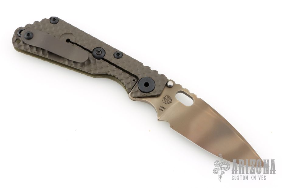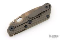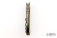 This SNG DGG by M Strider has a stonewashed and ghost striped blade with bronzed finish, dual thumb studs, thumbhole, and notched thumbrest. Handle is green G-10 and an antique bronze titanium "Gunner Grip", lockbar stabilizer, and titanium tip up clip. Nice detent, lockup and blade seating. New condition.