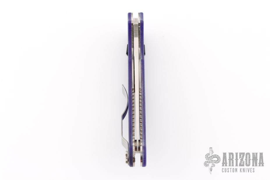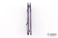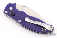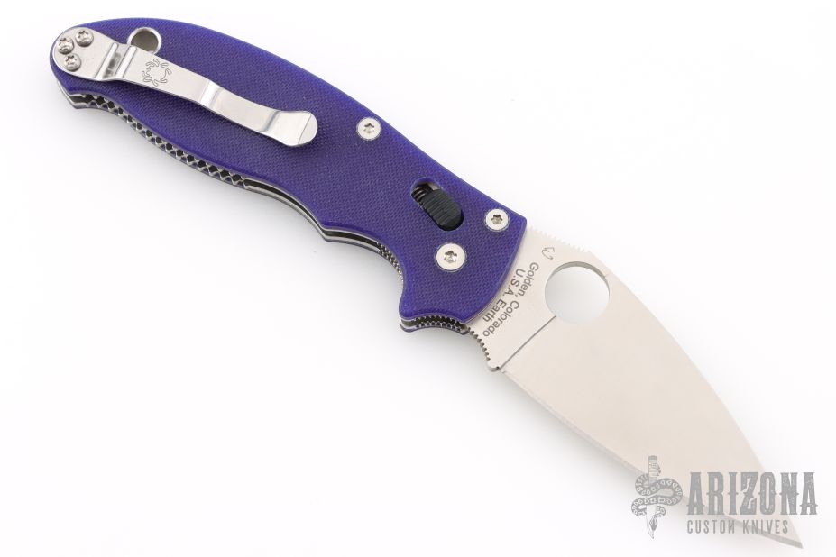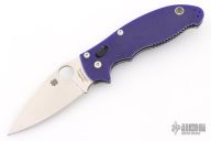 This Spyderco Manix 2 has a satin finished blade, thumbhole and notched thumbrest. The handle has a purple G-10 scales over steel liners and backspacer. Lanyard tube in pommel. Comes with original box and papers. New condition.