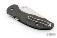 This Mantra 3 by Spyderco features a satin finished blade with notched thumbrest, thumbhole, and flipper. The handle has a carbon fiber frame with paper clip style clip, tip up reversible, stainless lockbar insert, lanyard hole with beaded lanyard. Comes with original box and papers. New condition.