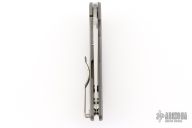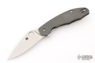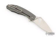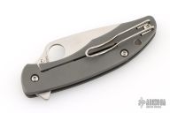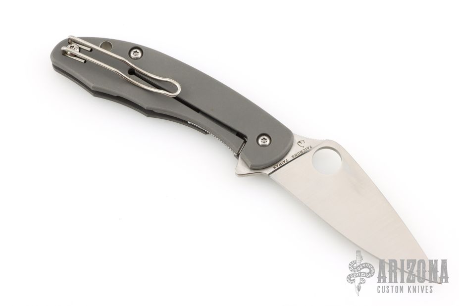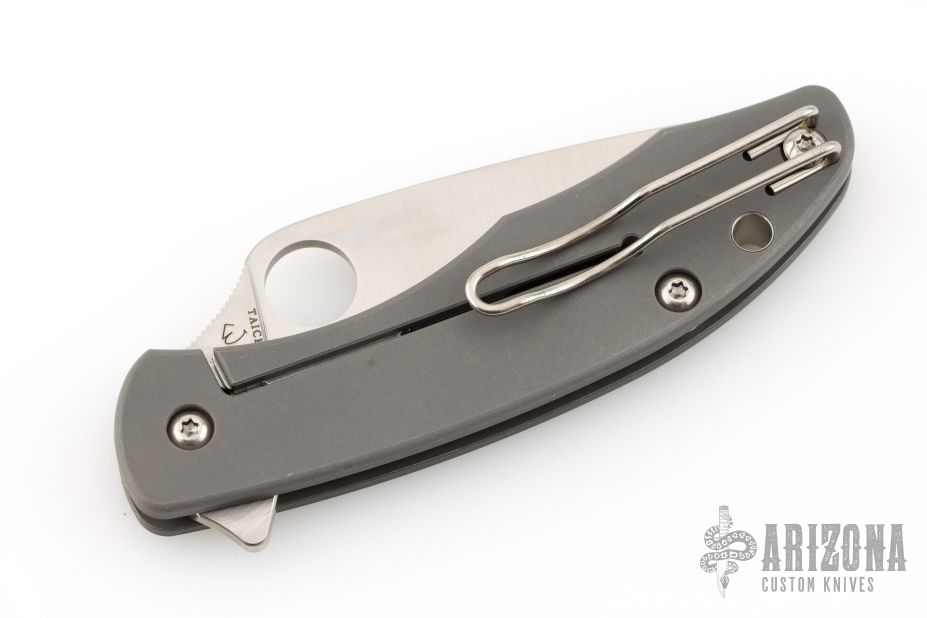 This Mantra Pln by Spyderco features a satin finished blade with notched thumbrest, thumbhole, and flipper. The handle has a tumbled titanium frame with paper clip style clip, tip up reversible, stainless lockbar insert, lanyard hole with beaded lanyard. New condition. Comes with original box and papers.