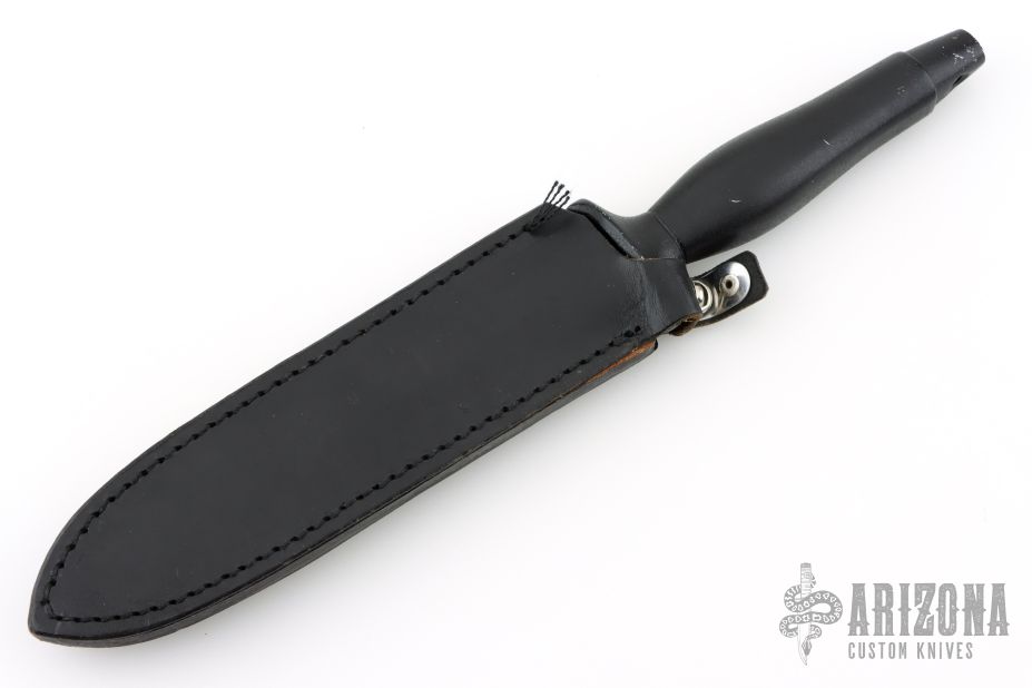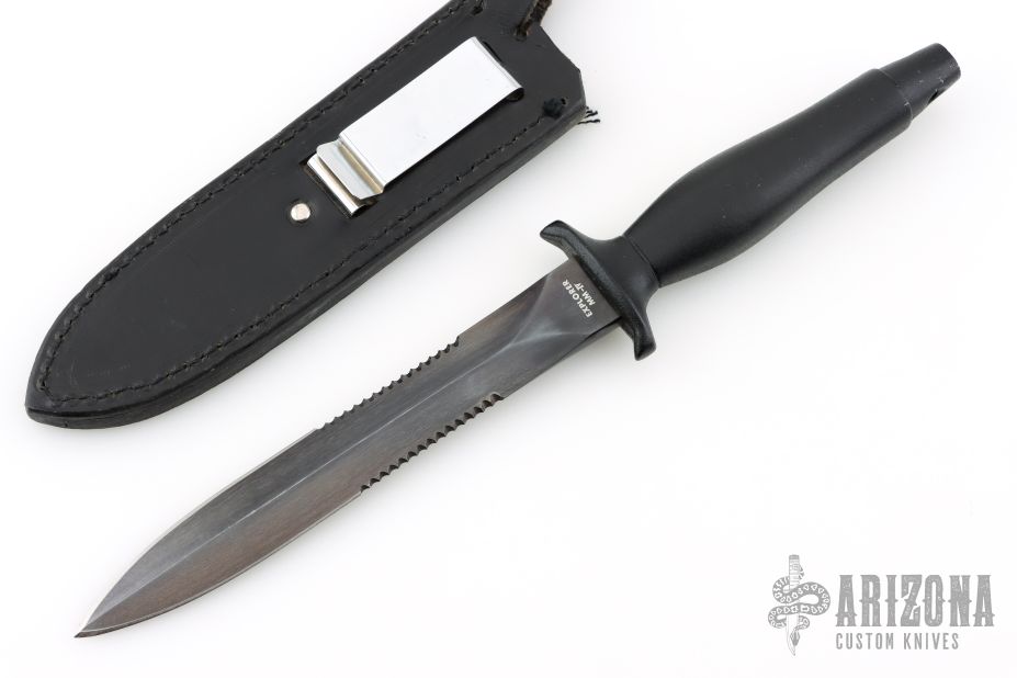This Mark II Style Dagger by Explorer has a blued and satin finished double edged blade with partially serrated edges, .256" blade stock and .957" blade depth, hidden tang construction. The handle has a cast aluminum grip with black coating. Comes with a black leather sheath. Has a couple light scratches, otherwise excellent condition.