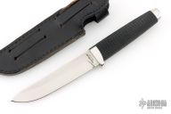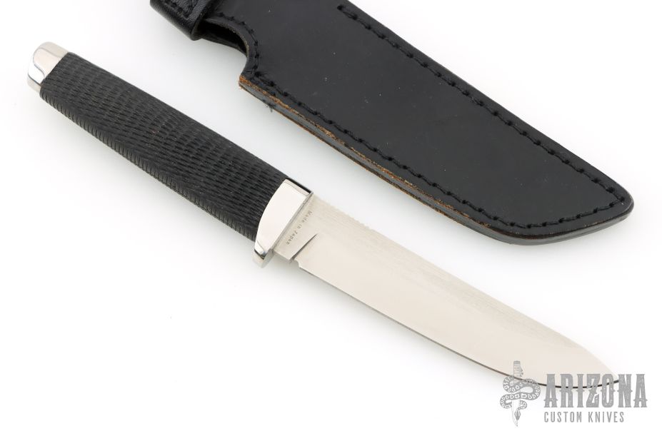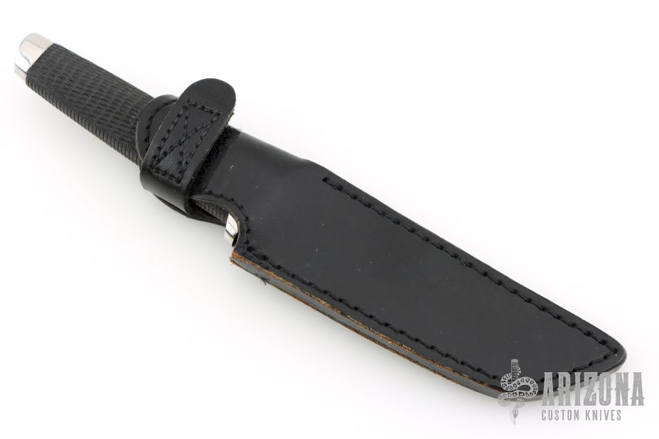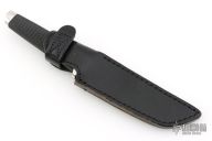 This Mini-California by Cold Steel features a drop point blade with a notched thumbrest, .158" blade stock and .844" blade depth, hidden tang construction. The handle has a stainless steel guard and pommel and rubber grip. Includes original black leather sheath. Made in Japan.  Has some light scratches, otherwise excellent condition.
