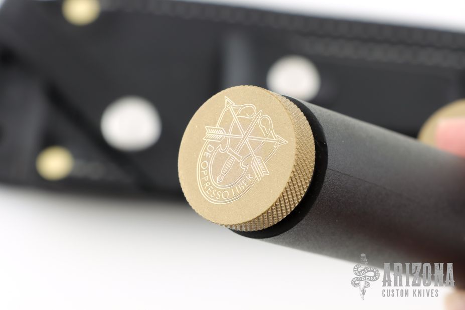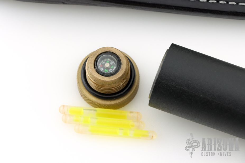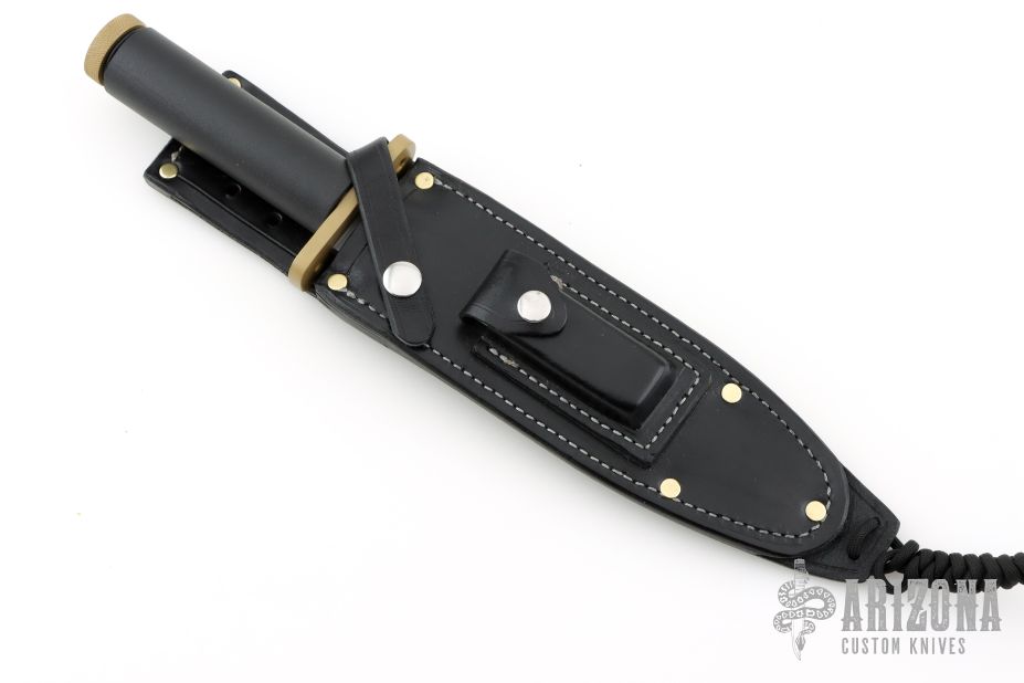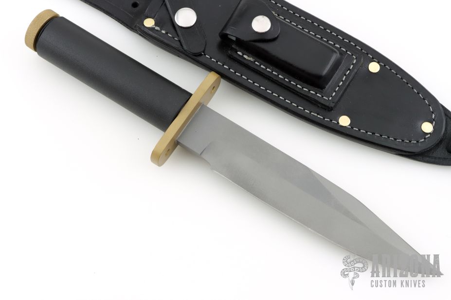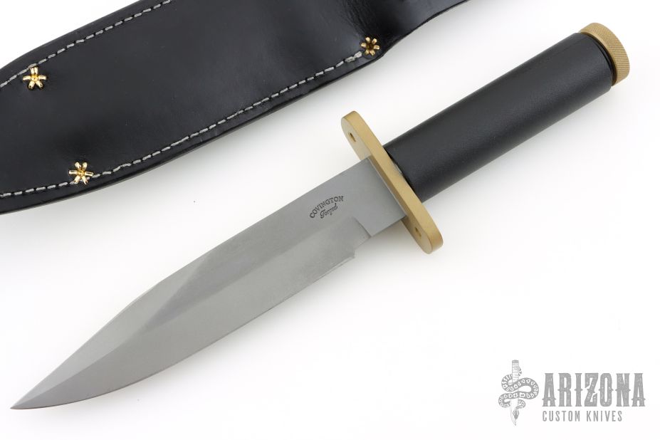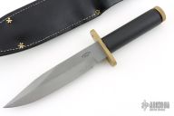 This Model 18 Replica by Greg Covington features a bead blasted clip point Model 14 style blade with sharpened top edge, .251" blade stock and 1.425" blade depth, hidden tang construction. The handle has a brass double guard, stainless steel hollow handle grip with rubber grip, brass removable butt cap with compass. Comes with a black leather sheath. Excellent condition.