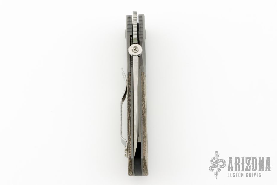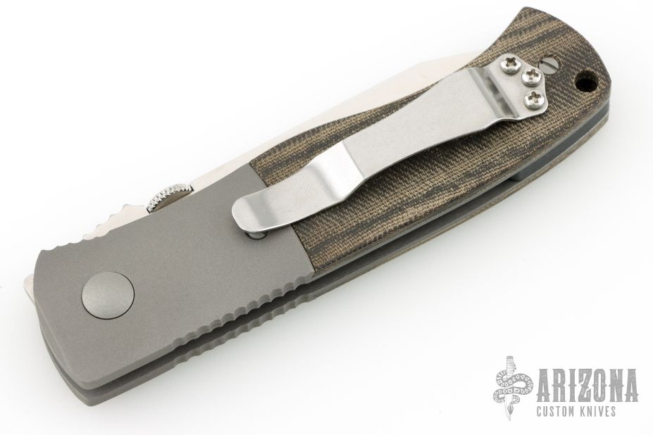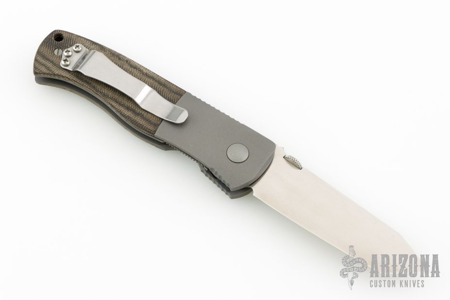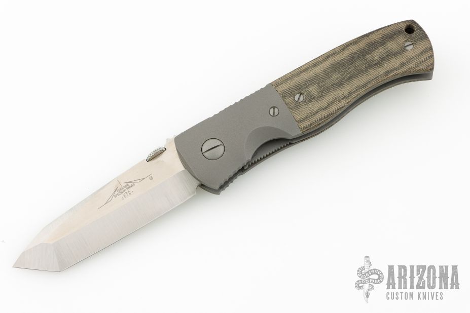 This Custom CQC-7 by Emerson Knives features a chisel ground satin finished CQC-6 style blade with notched thumbrest and thumbdisc. The handle has bead blasted and dovetailed titanium bolsters, green canvas micarta scales, bead blasted titanium liners, black G-10 backspacer, tip up stainless steel clip. Includes an Emerson Box.  Nice detent, lock up and blade seating.  This knife features a domed pivot and was made in 2001.  Excellent condition.