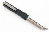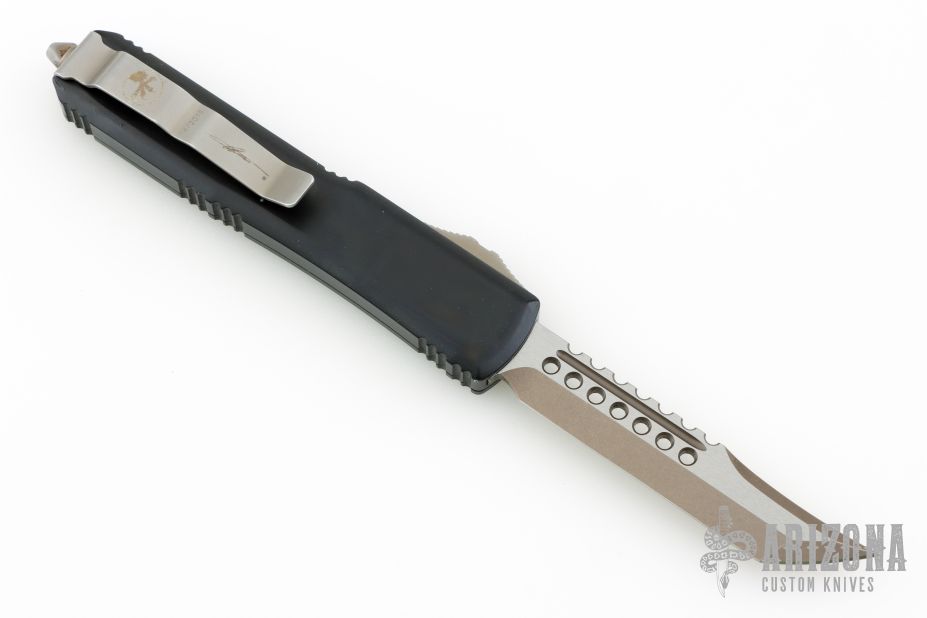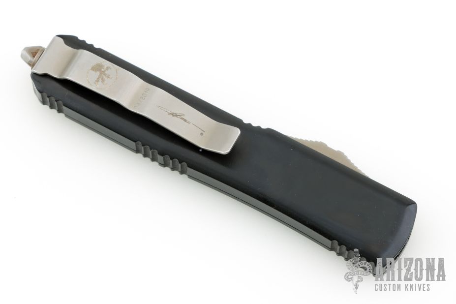 This Ultratech by Microtech Knives features a bronzed stonewashed Hellhound blade with satin flats and false top edge. The handle has a black aluminum frame with tip down stainless steel clip and hardware. 04/2019. Has some scuffs and scratches, otherwise good condition.