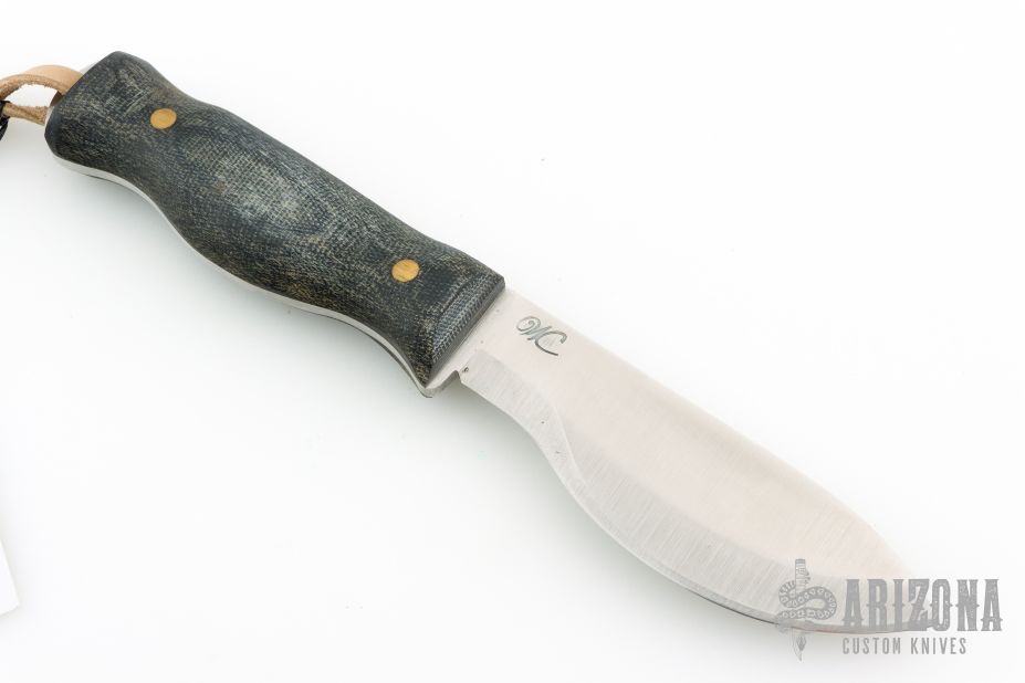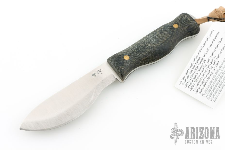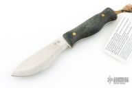 This Saner Scout by William Collins features a satin finished blade with .160" blade stock and 1.470" blade depth, full tang construction. The handle has black canvas micarta scales and brass pins, lanyard hole at the butt. Comes with a brown leather sheath with storage tin compartment. Has a couple light scratches, otherwise excellent condition.