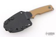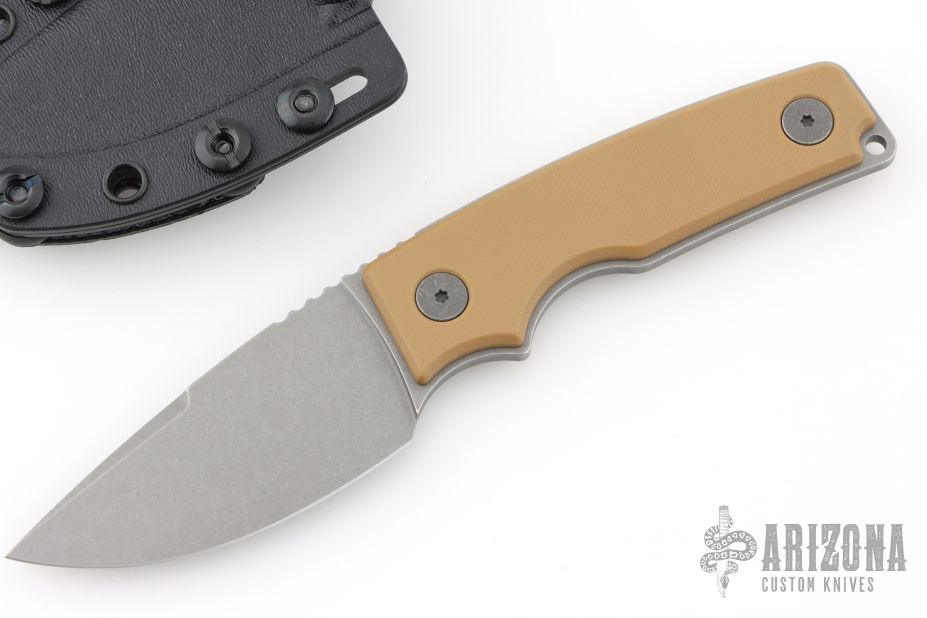 This Roosevelt Fixed Blade by OZ Machine Company features a stonewashed blade with false top edge and notched thumberest, .125" blade stock and 1.300" blade depth, full tang construction with coyote brown G-10 scales. Comes with a kydex sheath with Ulti-Clip. New condition.