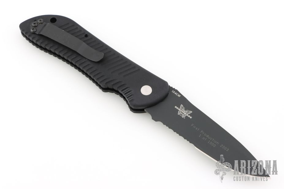 This 9130SBT-01 Taurus 24/7 Auto by Benchmade has a black partially serrated blade, black aluminum frame with tip up stainless steel clip and a safety. Comes with original box and papers. Excellent condition. First Production 2003 1of1000