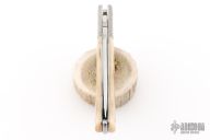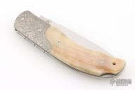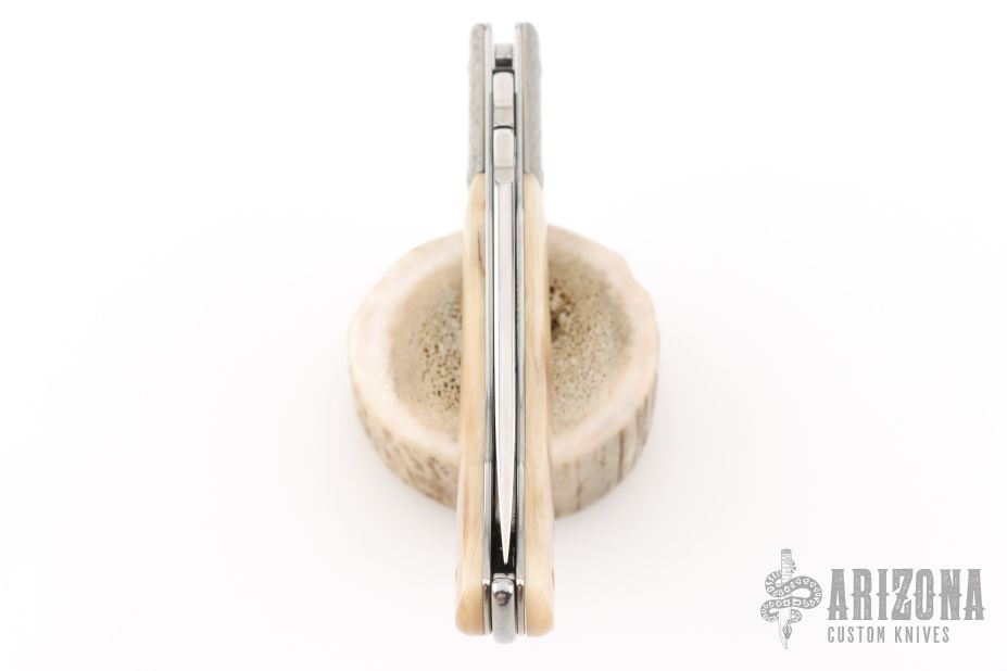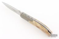 This knife features a mirror finished blade with fileworked spine.  The handle has textured nickel silver bolsters, sheephorn scales, stainless steel liners and fileworked backspacer. Excellent condition. Comes with original box, papers and leather slip sheath.