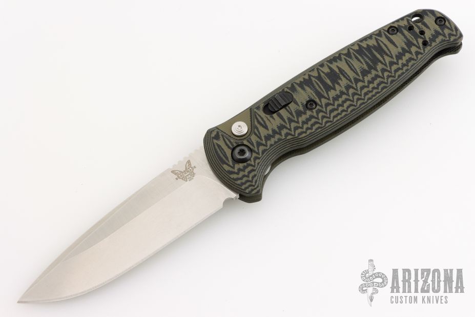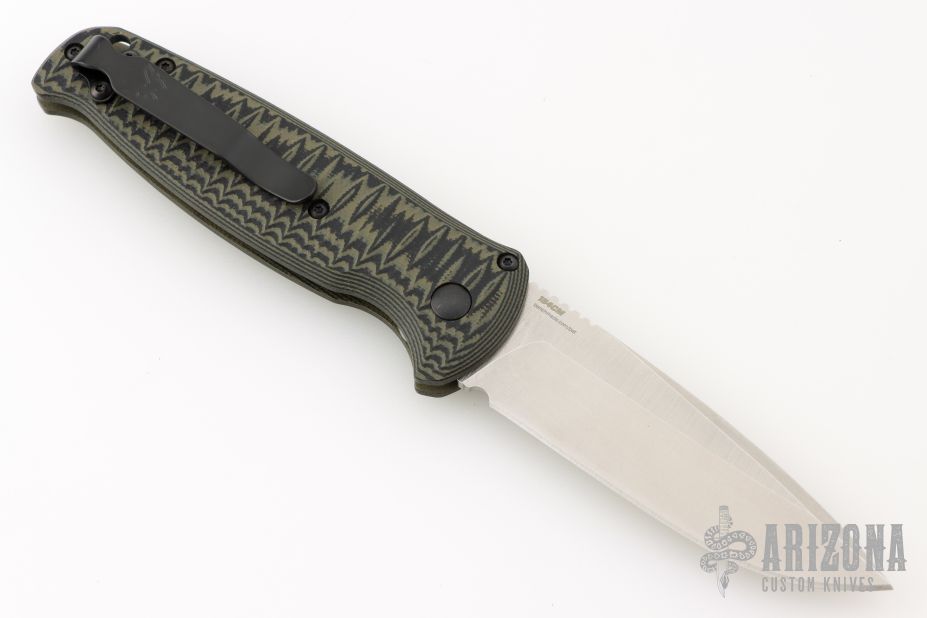 The CLA Composite Lite Auto by Benchmade Knives features a stonewashed drop point blade with a notched thumbrest. The handle has a G10 frame with a black steel tip-up pocket clip. Includes the original box and papers. Excellent Condition.