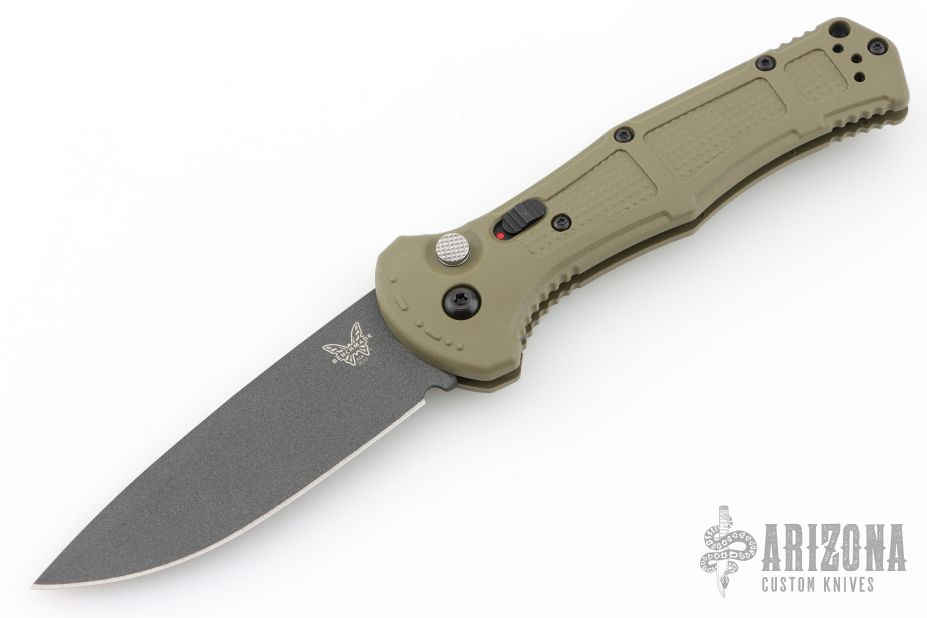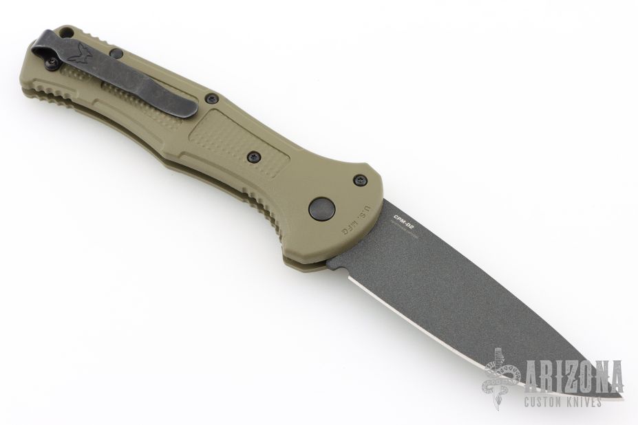 An explosive design, bound to take the battlefield by storm. The 9070SBK-1 Claymore is a slender push-button powerhouse, packed full of hidden features and inspired by one of the most notorious directional mines. Incorporating this air-hardening tool steel to Benchmade’s portfolio of premium materials, the Claymore blade has been crafted from CPM-D2 to provide ample toughness and edge retention. Manufactured in the USA, the Claymore has set the standard for closed break strength, making this Benchmade's toughest folder to date. Comes with original box and papers. Excellent condition.