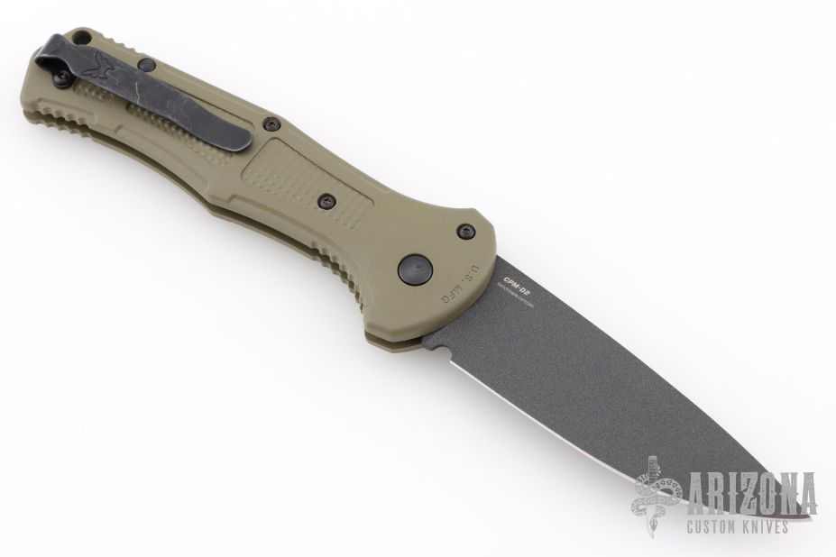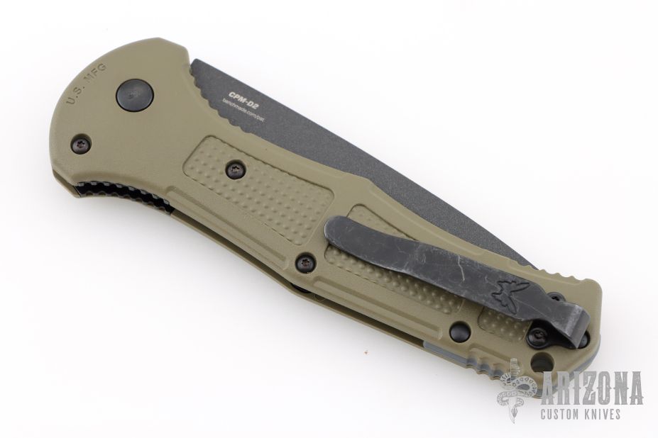 An explosive design, bound to take the battlefield by storm. The 9070SBK-1 Claymore is a slender push-button powerhouse, packed full of hidden features and inspired by one of the most notorious directional mines. Incorporating this air-hardening tool steel to Benchmade’s portfolio of premium materials, the Claymore blade has been crafted from CPM-D2 to provide ample toughness and edge retention. Manufactured in the USA, the Claymore has set the standard for closed break strength, making this Benchmade's toughest folder to date. Comes with original box and papers. Excellent condition.