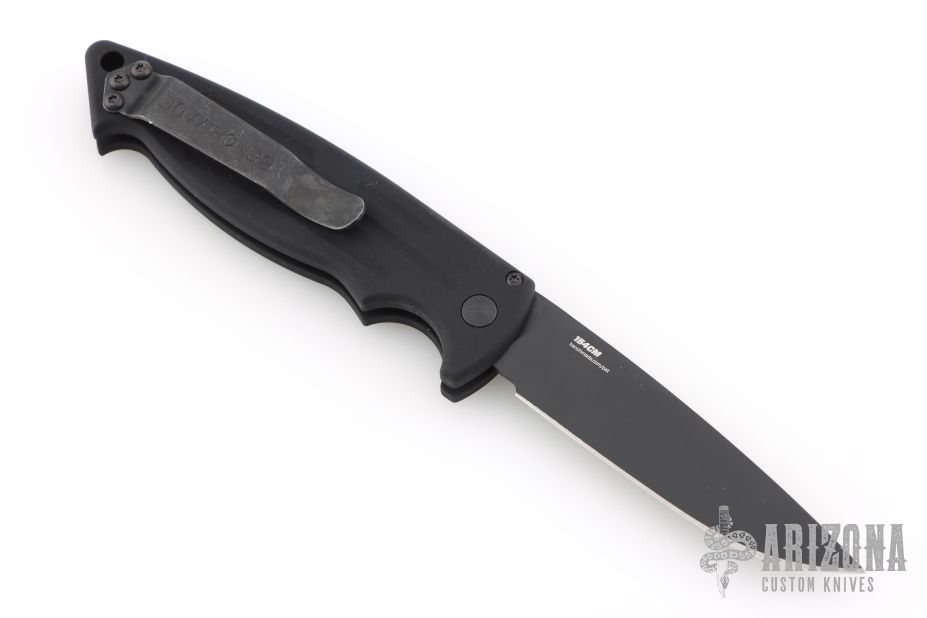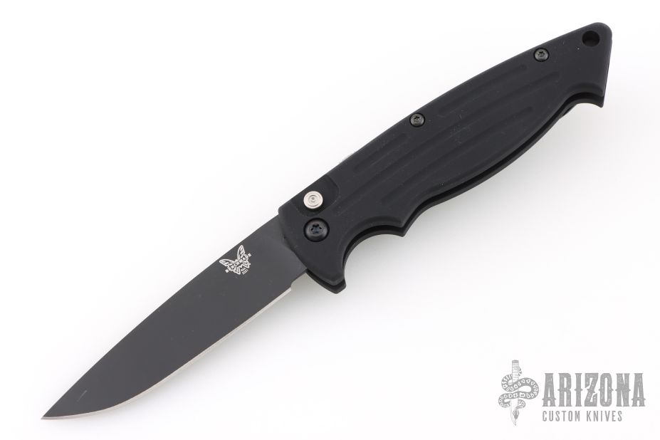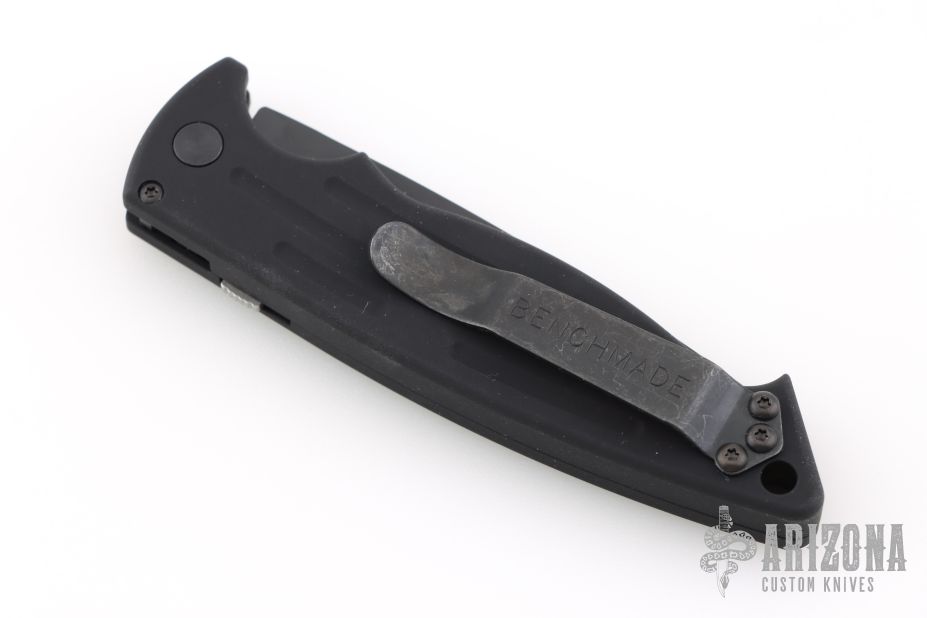 This Mini Reflex by Benchmade features a black drop point blade and a black aluminum handle with black stainless steel tip up clip, lanyard hole at the butt and safety on the spine. Comes with original box and papers. Excellent condition.