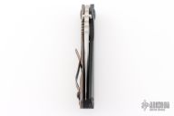 This SNG framelock folder by Mick Strider features a stonewashed Nightmare Ground blade with thumbstuds, notched thumb rest, and thumb hole. The handle features a G10 cover, and anodized, orange peel finished, jigged titanium frame and tip up titanium clip. Includes a "Lock Bar Stabilizer" for maximum reverse lock retention. Nice detent, lockup and blade seating. Comes in Dragon Cut Strider pouch. Signed in the finger choil. Excellent condition.