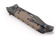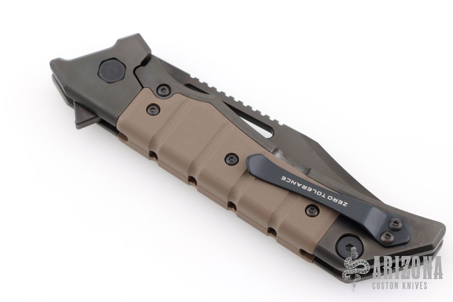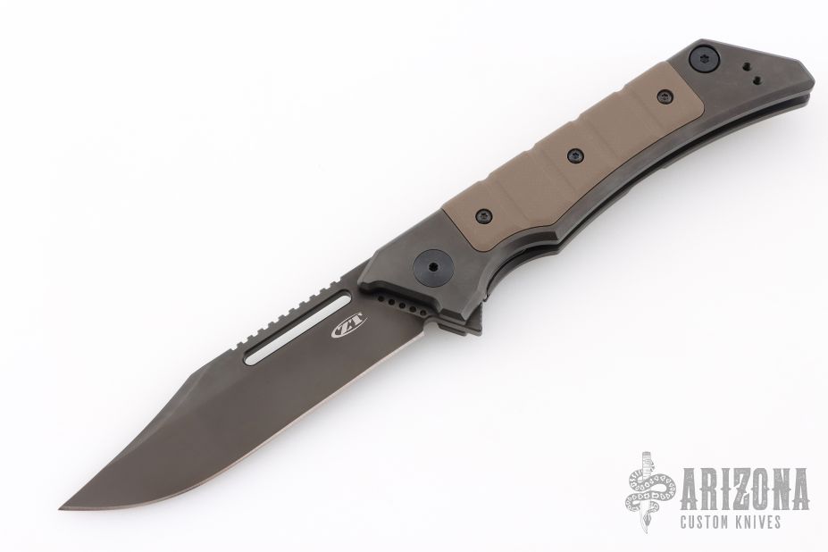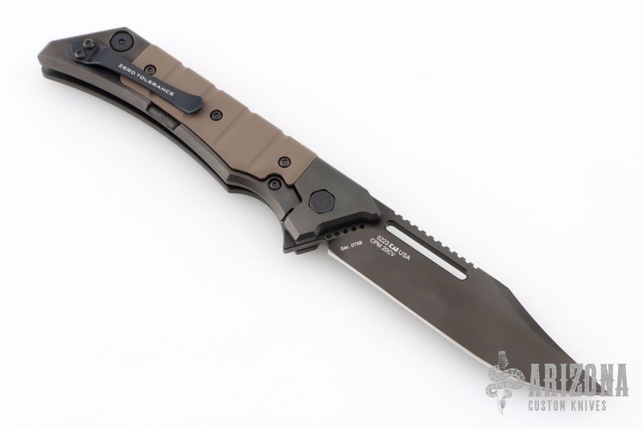 Tim Galyean's design prowess is on full display in this classic military knife inspired Zero Tolerance 0223 folding knife. The classic bowie blade is made from CPM-20CV steel in a black DLC coating. Earth brown G-10 scales mimic the original Military leather stacked handle with a titanium frame lock providing added stability. A reversible tip-up pocket clip completes the solid Tim Galyean design.