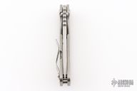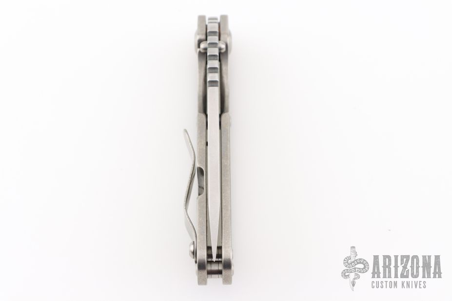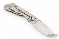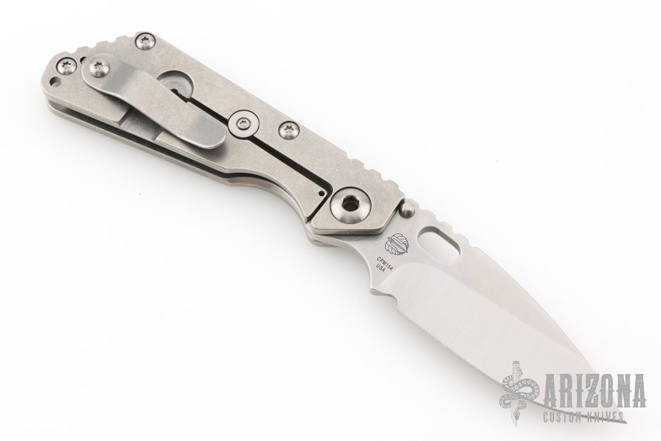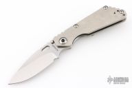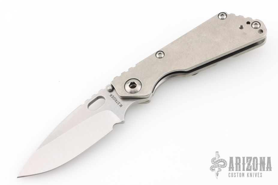 This Mick Strider Performance series SNG framelock folder features a satin finished drop point blade with thumbhole and notched thumbrest. The handle has a stonewashed titanium frame with titanium deep carry clip, tip up carry. Jimping on blade spine. Includes Hinderer "Lock Bar Stabilizer" for maximum reverse lock retention. Excellent lockup, detent, and blade seating. Excellent condition.