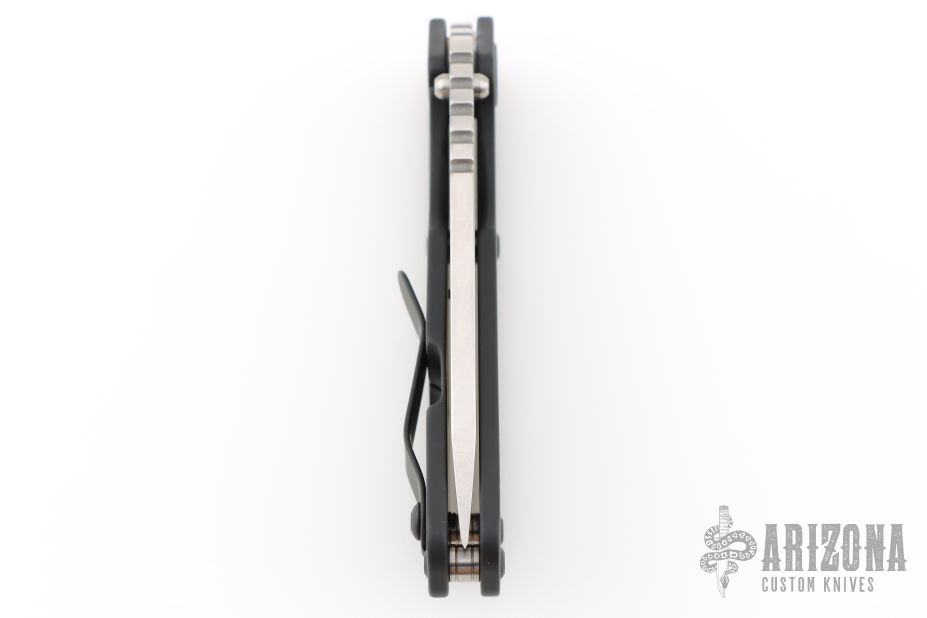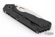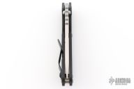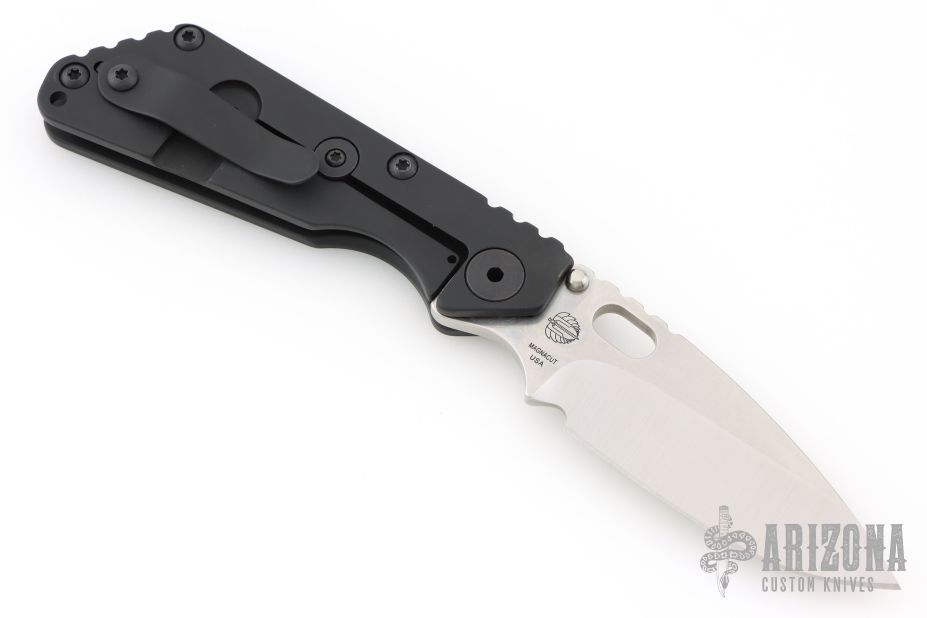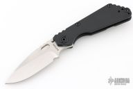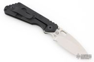 This Mick Strider SNG framelock folder features a satin/stonewash finished drop point blade with thumbhole and notched thumbrest. The handle has a black titanium frame with titanium clip, tip up carry. Jimping on blade spine. Includes Hinderer "Lock Bar Stabilizer" for maximum reverse lock retention. Nice detent, lockup and blade seating. Excellent Condition.
