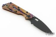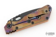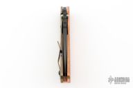 This SMF framelock folder by Mick Strider features a black blade and a gunner grip pattern copper and orange peel finished and anodized titanium frame and tip up titanium clip. Includes a "Lock Bar Stabilizer" for maximum reverse lock retention. Nice detent, lockup and blade seating. New from maker at the 2025 Blade West!